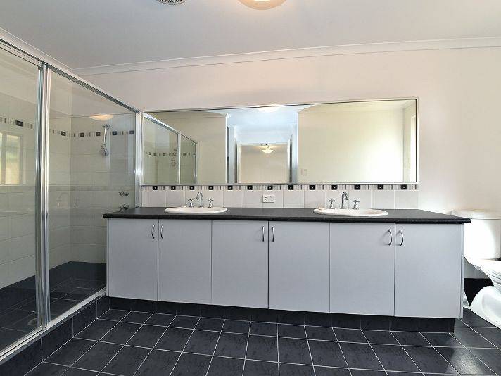 Modern ensuite with extra-large twin shower (with glass door screen), full length bench/mirror, twin vanities and all with plenty of room to move