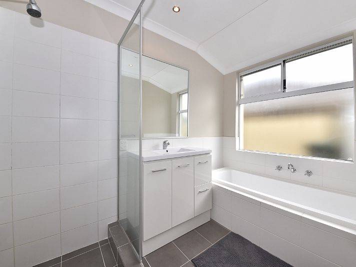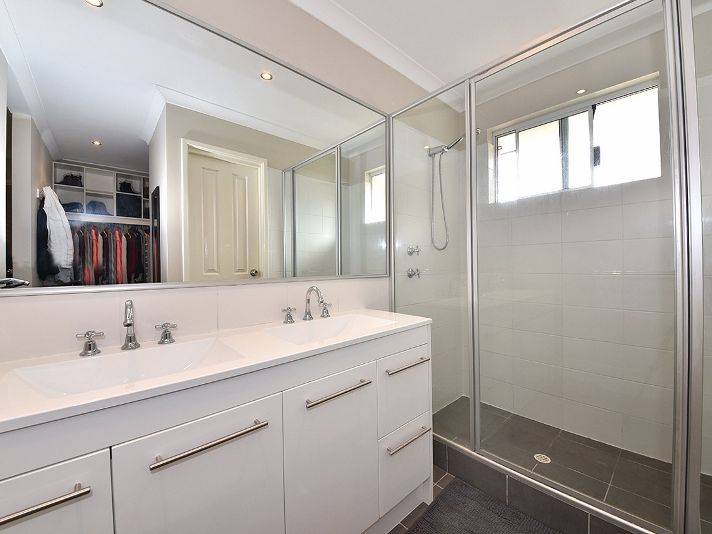 Light and bright modern ensuite with twin vanities, extra length shower (with screen), separate toilet and stylish fixtures and fittings