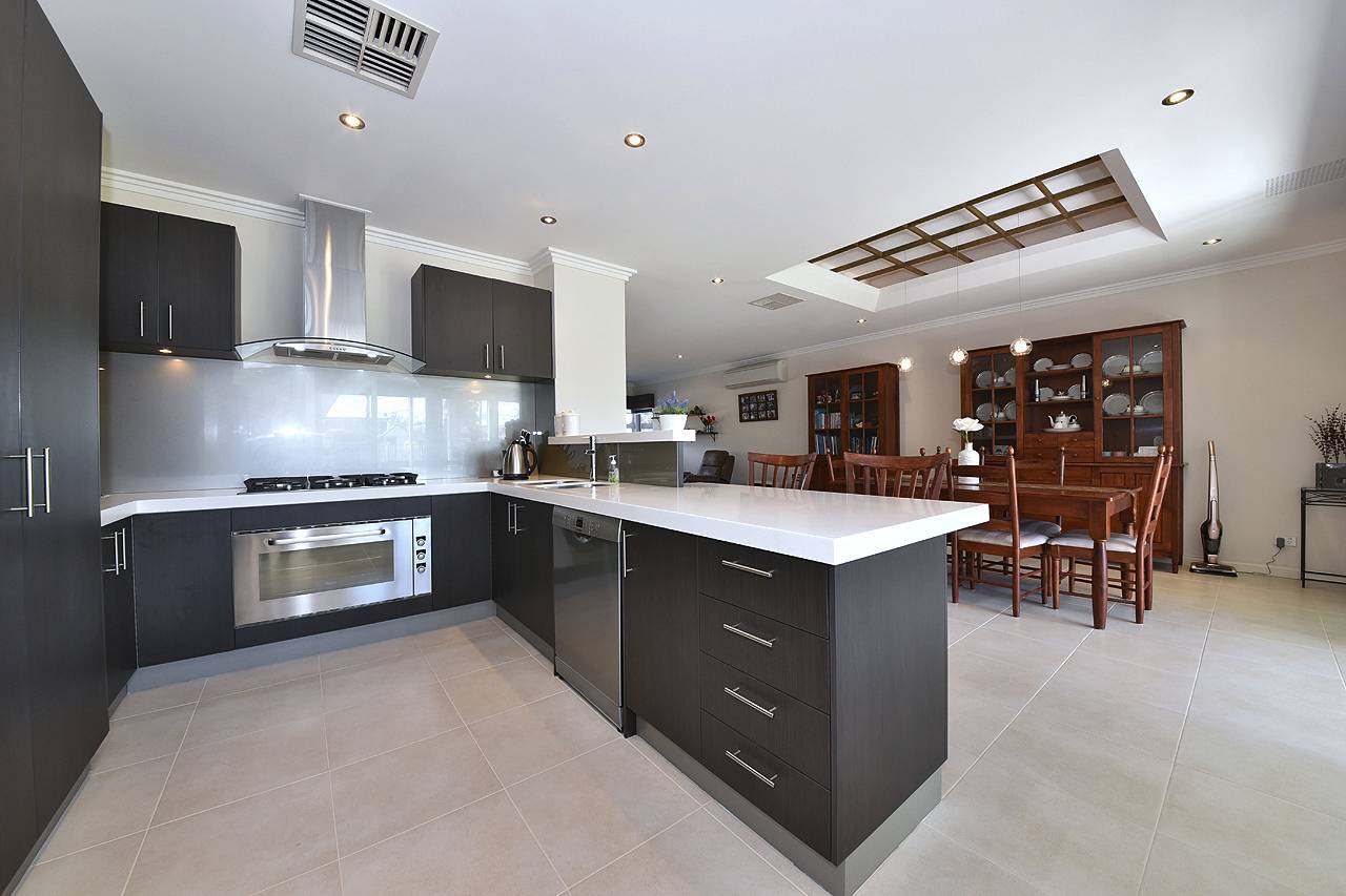 The kitchen is the heart of the home, and what a heart! Corian bench-tops, 5 burner gas cooktop with a Wok burner, big 900mm oven with room enough to cook for all your family and visitors. Easy clean, stylish glass splash-back and a glass canopy range-hood add practical quality, together with the dishwasher.