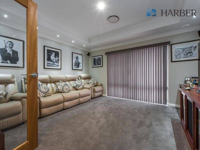 The kitchen overlooks a vast open plan family living and dining area, plus the great outdoors. The kitchen also features a big scullery, stone bench tops with walk in pantry, servery windows to alfresco and is handy to the well-appointed laundry. There’s a separate home theatre room, a large walk in linen storeroom, extra high ceilings plus reverse cycle ducted air-conditioning and LED lighting throughout.