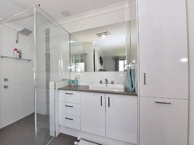 Fully renovated ensuite with modern fixtures and fittings, walk in shower, full height tiling, stone bench tops, plenty of cupboard space, heat lamp and separate WC