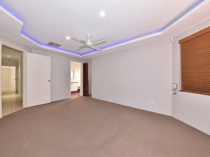 Spacious master bedroom with walk in robe, ceiling fan and feature bulkhead with stylish lighting