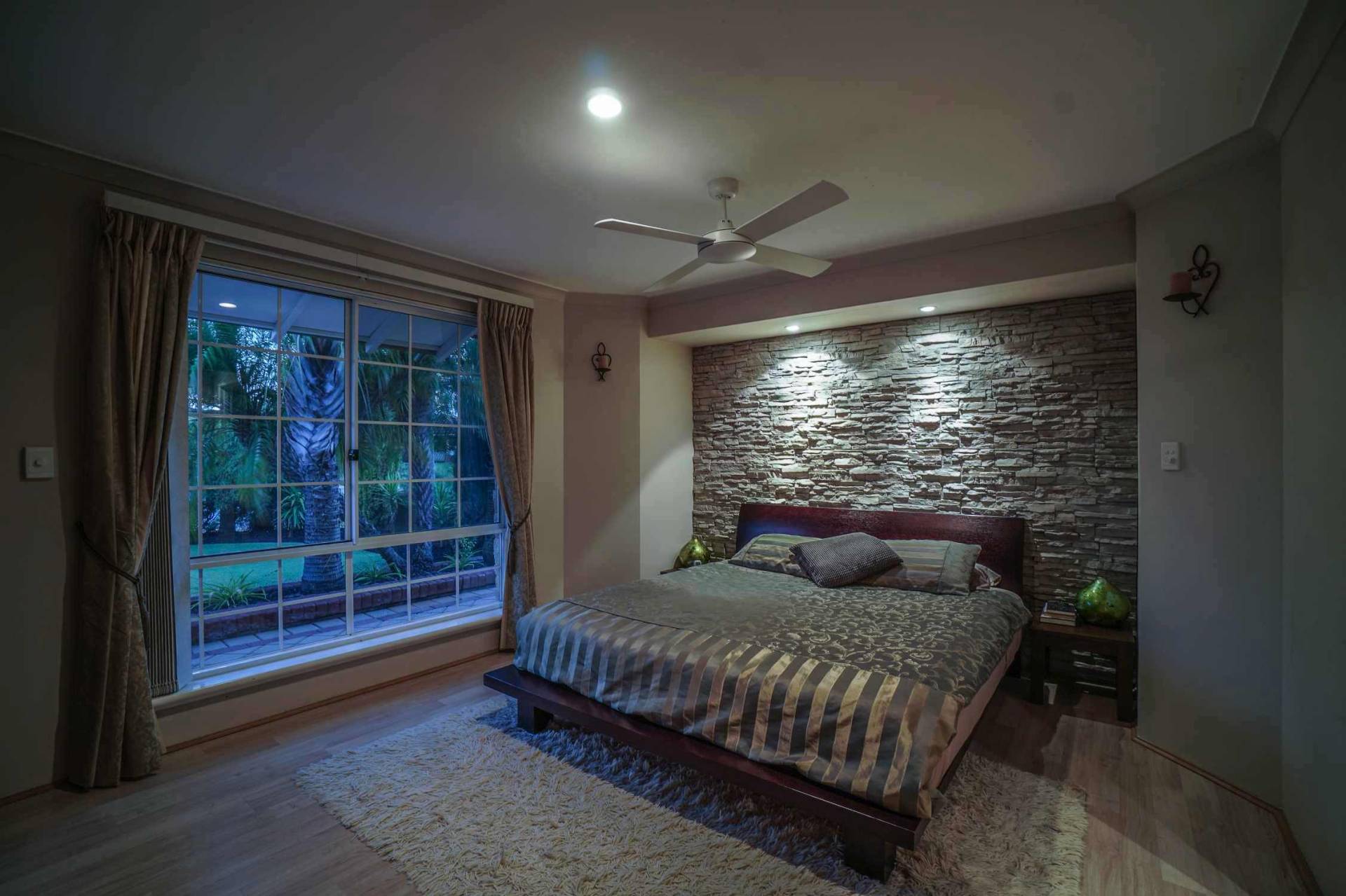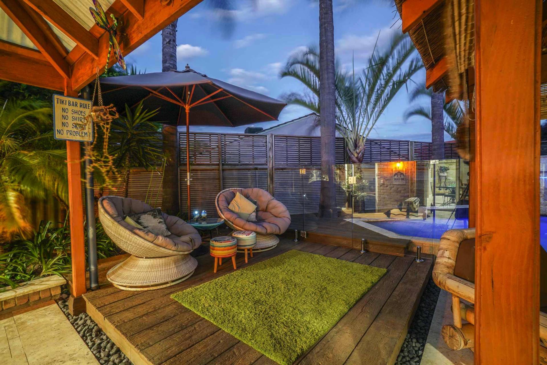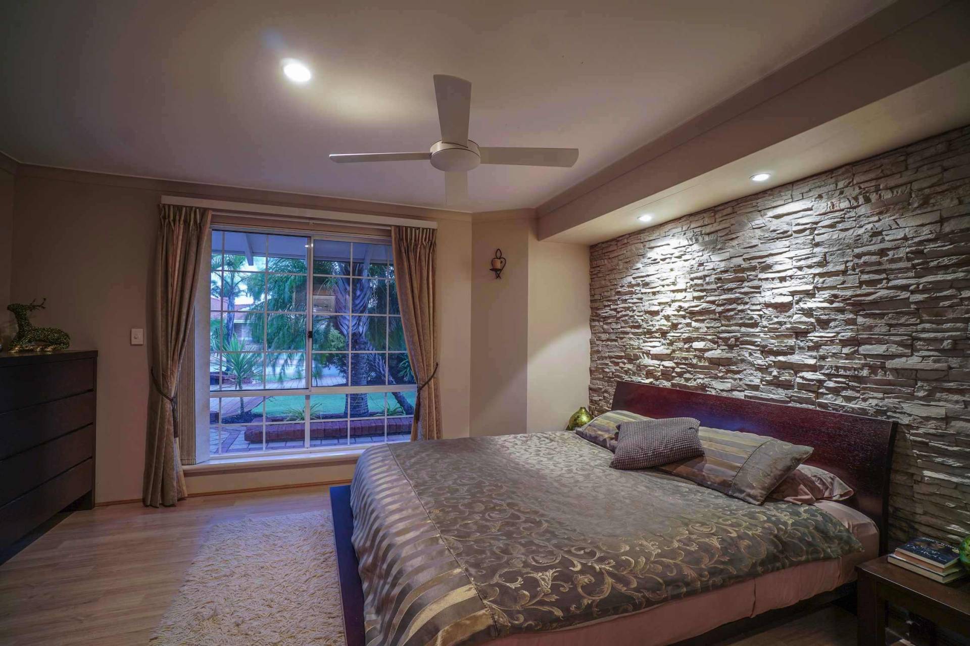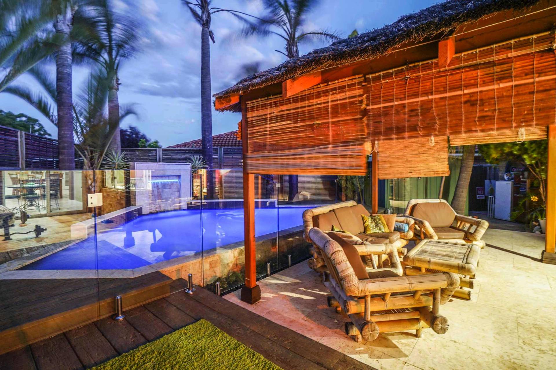 Step down from the entrance into the front living/dining area with floating timber floors, ceiling fan and vaulted raised ceiling. Further down the hallway you will enter the spacious and well laid out open plan family, meals and kitchen area making entertaining a breeze. The 3.2m high ceilings and large split system air conditioner will make this the entertaining hub for your family and friends. The large kitchen with a plethora of cupboard space, built in pantry, gas gook top, breakfast bar and shoppers entrance has always been the heart of this family home. This area opens out onto possibly Ballajura’s best outdoor area! The huge patio area has stunning coral stone paving which leads to your own Bali hut to make you feel like you have your own Balinese villa. And no luxury Balinese villa is complete without a stunning pool with spa zone and water fall feature. All of this in the privacy of your very own back yard. This 621sqm block also has manicured gardens with a raised veggie patch and a good sized garden shed. I know what you’re thinking…”running a pool can be expensive!” Well, not with the 25 solar panels on the roof outputting a massive 6kw of power.