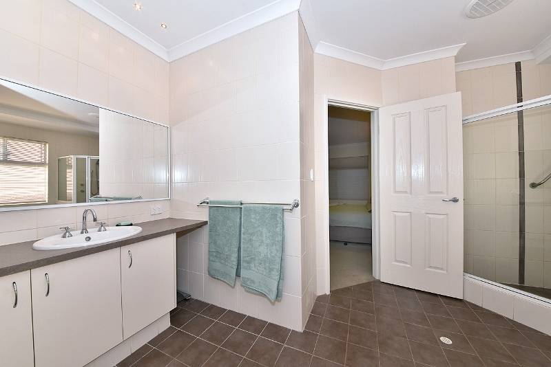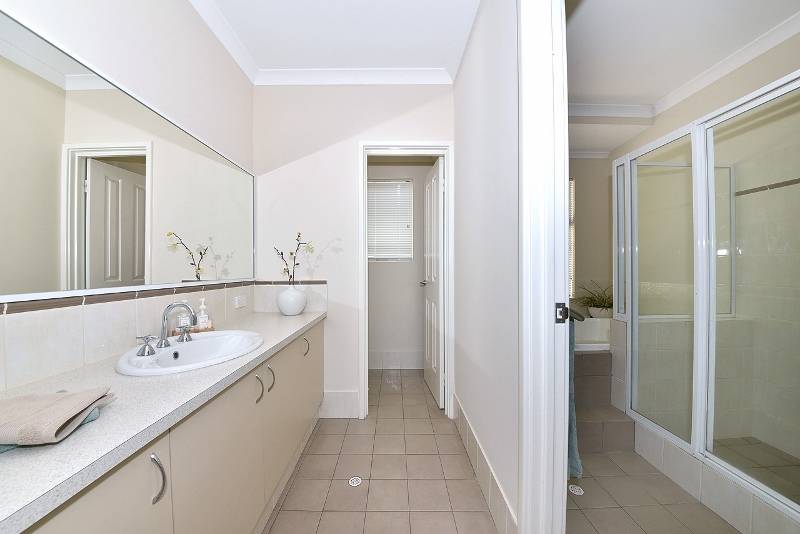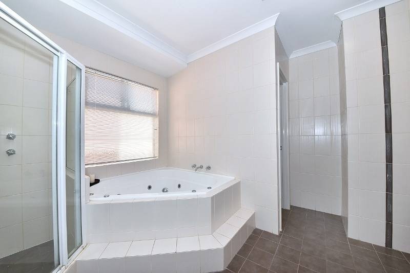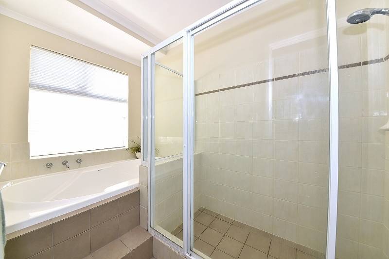 Generous sized, modern ensuite with full height tiling, corner spa bath, sizable shower (with glass screen), extra length bench/cupboard space feature lighting and separate WC