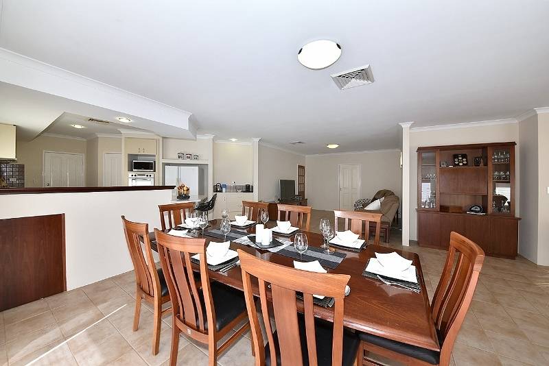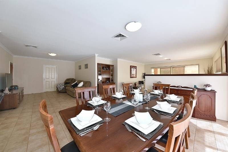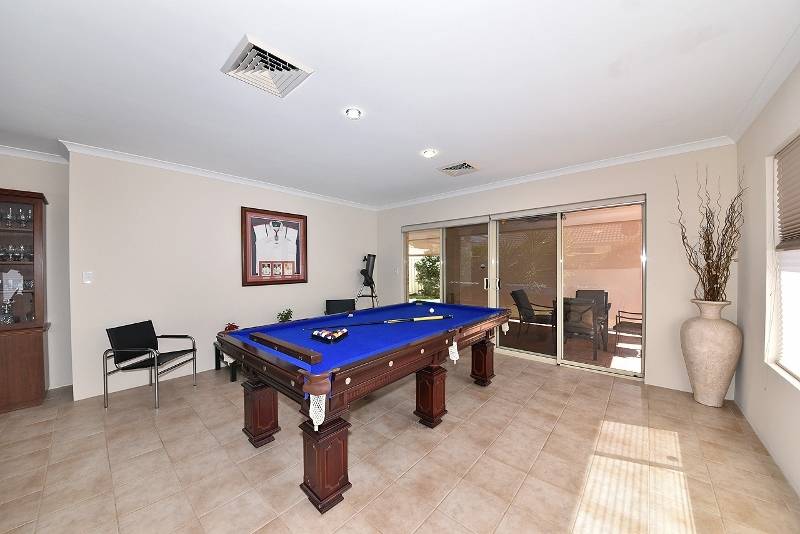 Expansive open plan meals, living and games room with feature recess and wall plus quality dual action Verosol block out blinds and double sliding door access to outdoors