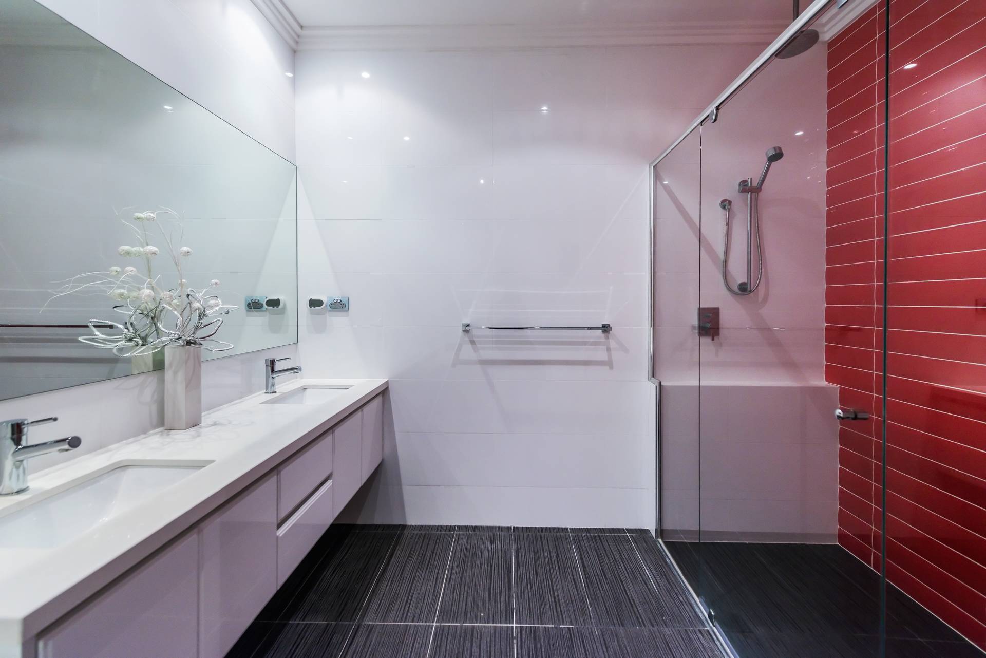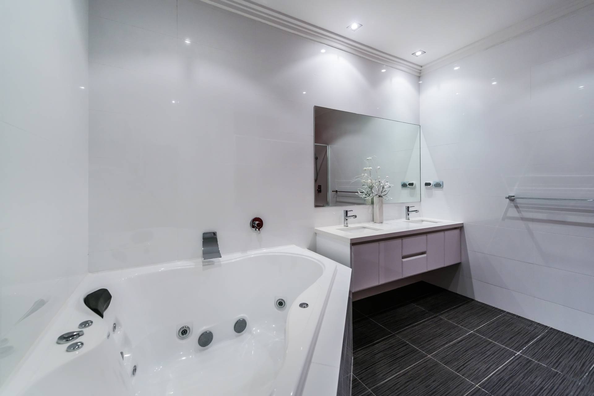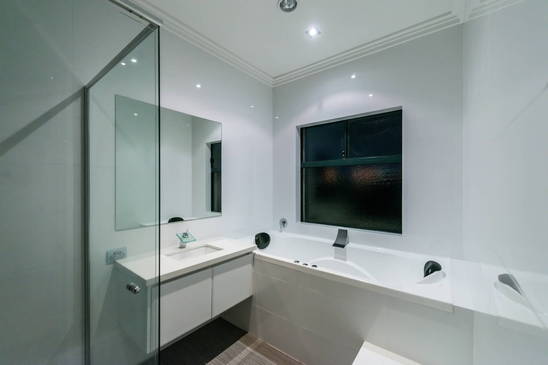 • Upstairs bathroom, shower with handheld shower head, single vanity with mixer, spa, double heat lamps