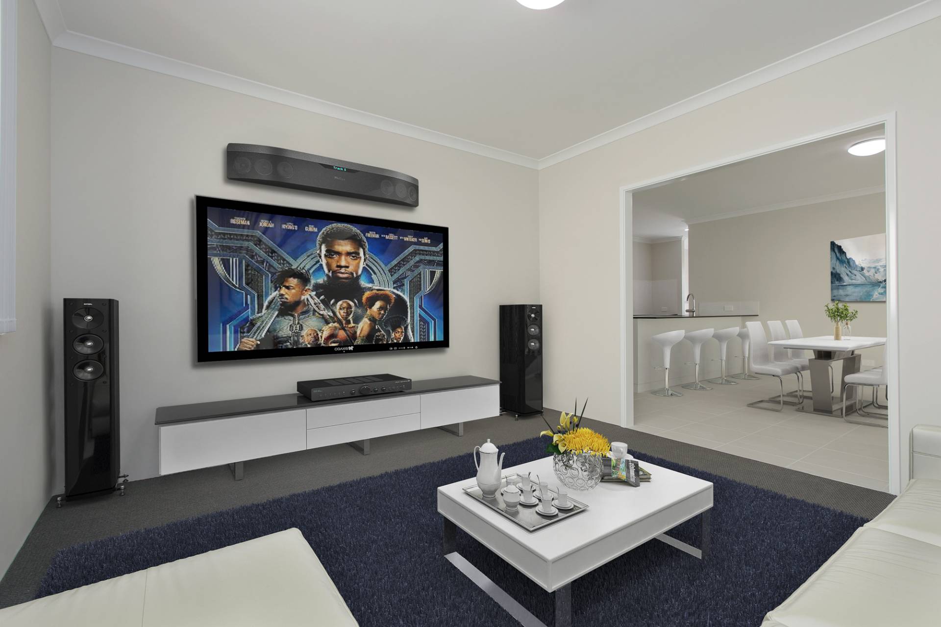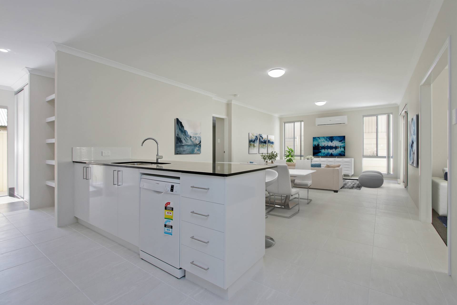 - Kitchen with stone bench tops, double sinks, open pantry and breakfast bar
