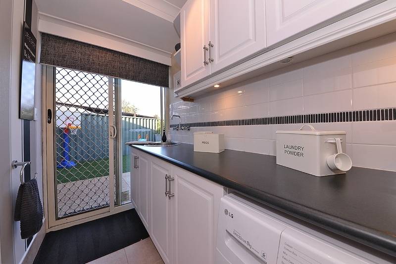 Modern laundry with overhead cupboards and bench space with sliding door access to outdoor kids play area with synthetic lawn and cabana