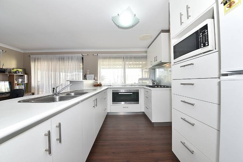 Renovated kitchen with gas hotplates, 900ml underbench oven, rangehood, glass splashbacks,  microwave recess and fridge recess, all with ample bench and cupboard space