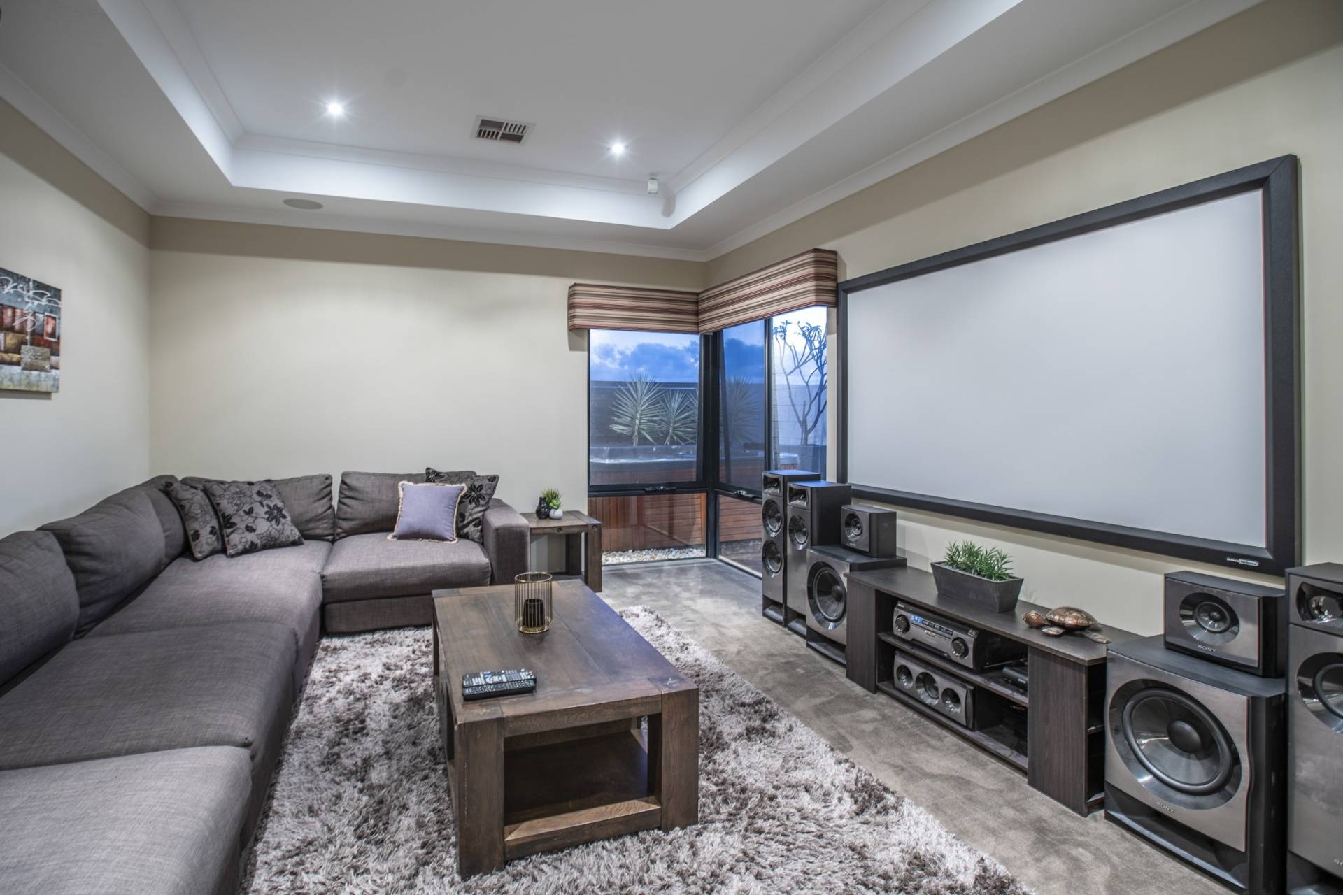 The huge open plan kitchen, dining, living is attached to the projector powered theatre room. special mention has to be made to gorgeous chef’s kitchen; donning a large island benchtop, commercial style basin with professional dishwasher’s fixtures, filter water tap, 5 point gas cooktop, 900mm oven, dishwasher and ampe cupboard space.