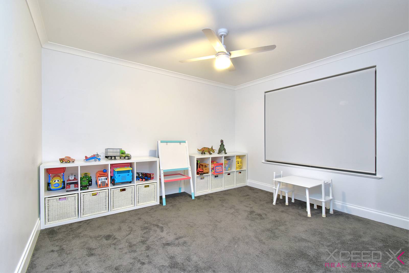 The lower level plays host to an expansive open-plan family, dining and kitchen area where sleek Hamptons-style cabinetry meets sparkling stone bench tops, a built-in storage pantry, a breakfast bar for casual meals and seamless outdoor access to an airy backyard with sprawling green lawn and a paved entertaining courtyard. Nearby, gorgeous double French doors reveal a carpeted theatre room – with a ceiling fan – that also works well as either a games or children’s playroom, depending on your personal needs.
