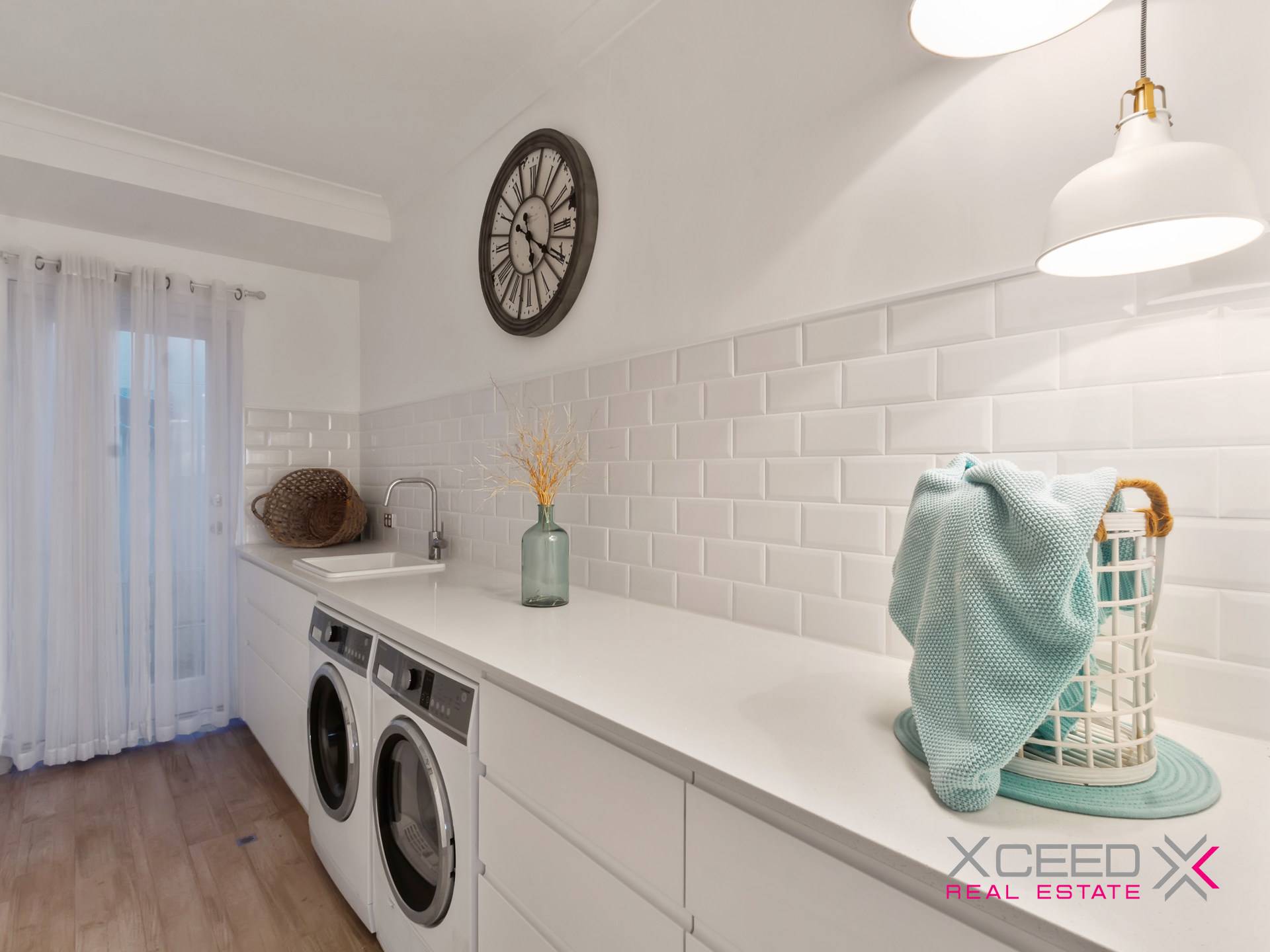 • Sleek and stylish galley-style laundry with stone bench tops and outdoor access to the side drying courtyard