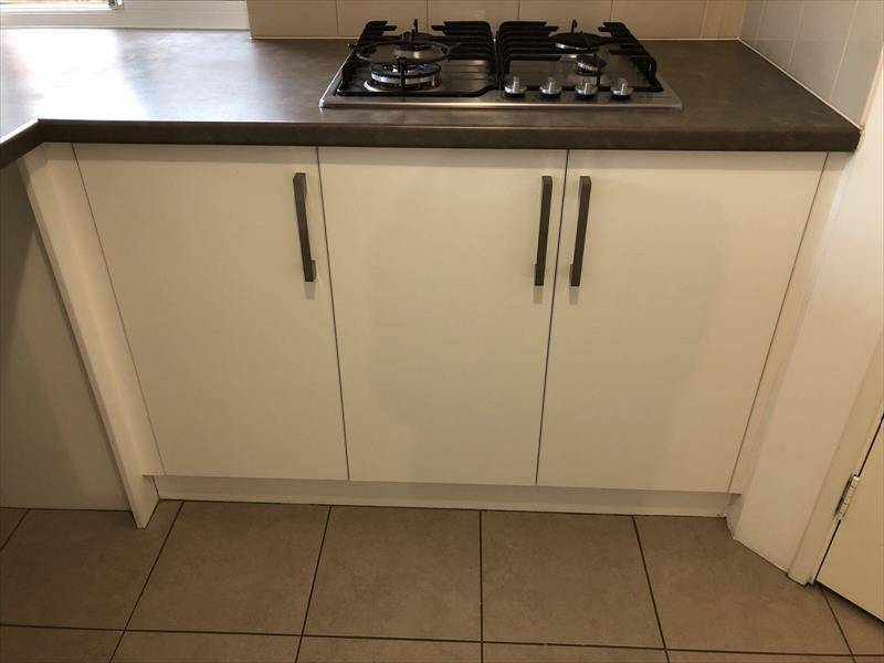 - Modern-kitchen, with stainless steel range-hood, oven and cook top and space for a dishwasher