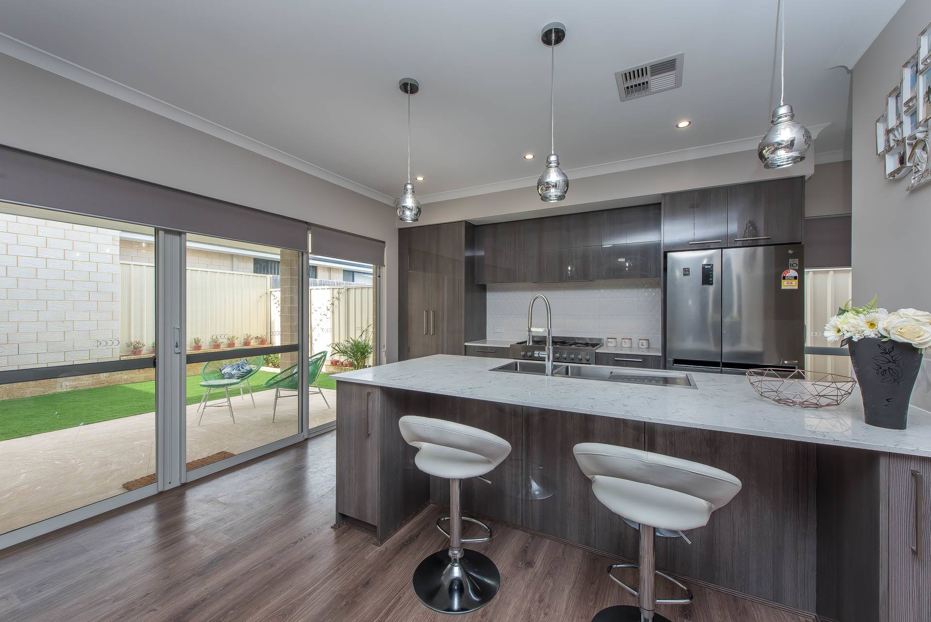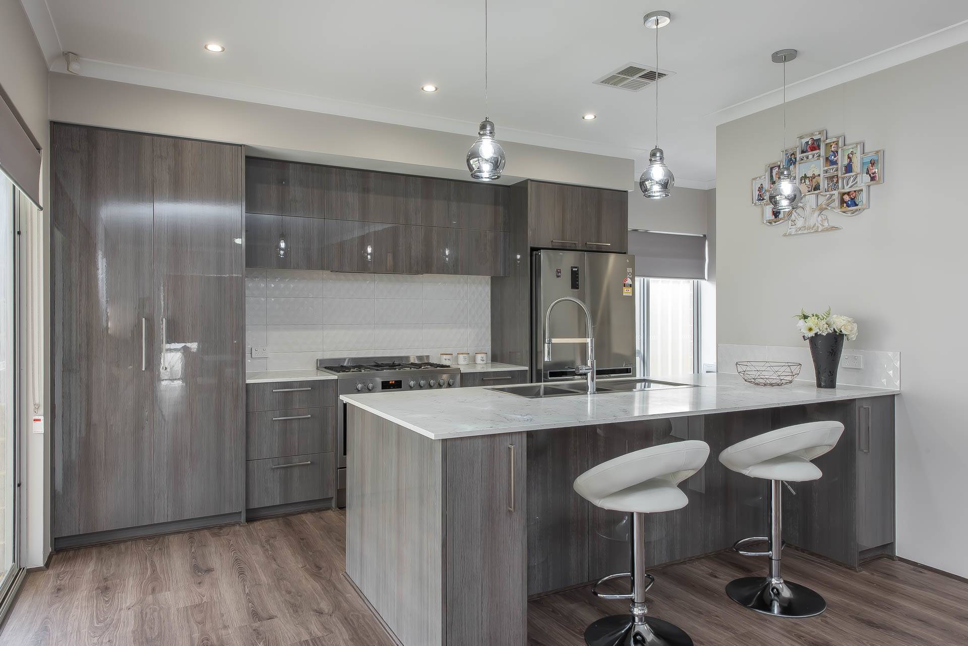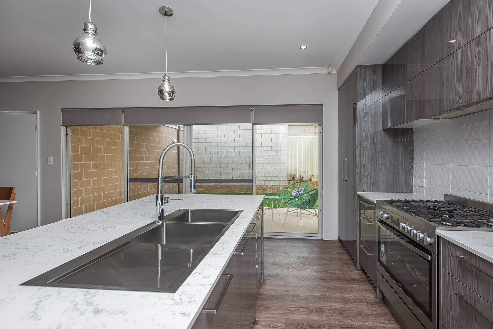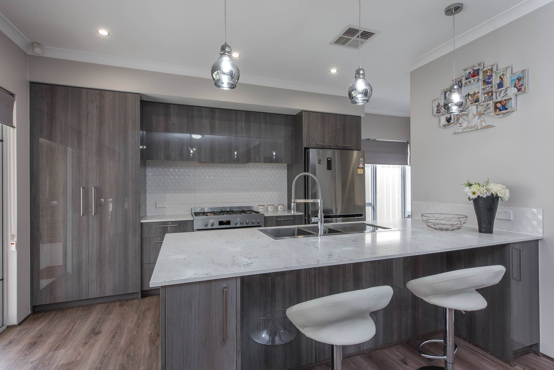 Stunning gourmet kitchen with large stone bench tops, soft closing doors and drawers, pot drawers, separate microwave recess, and premium tapware.
