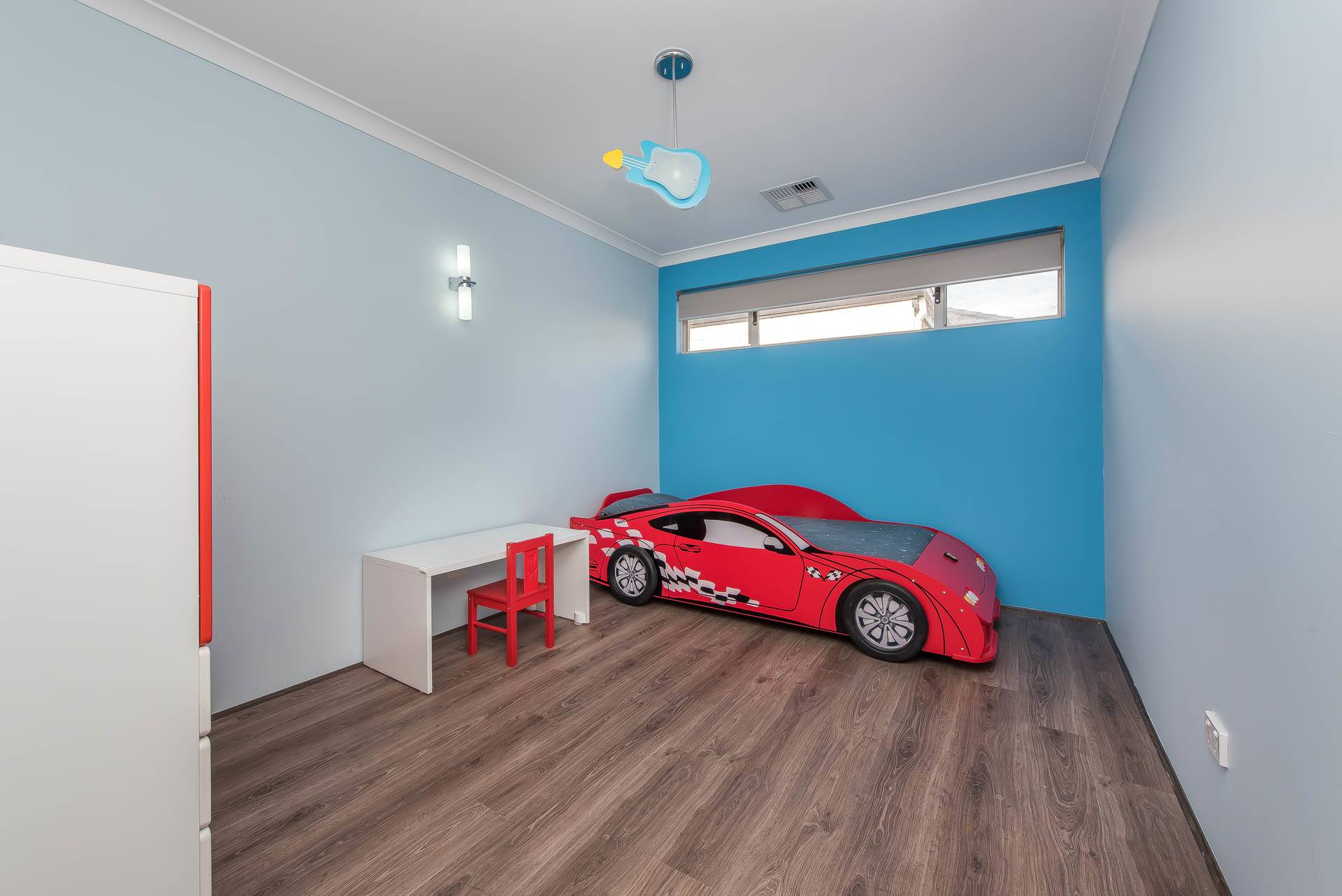 The custom designed kids room with a beautiful pendant and wall lights.