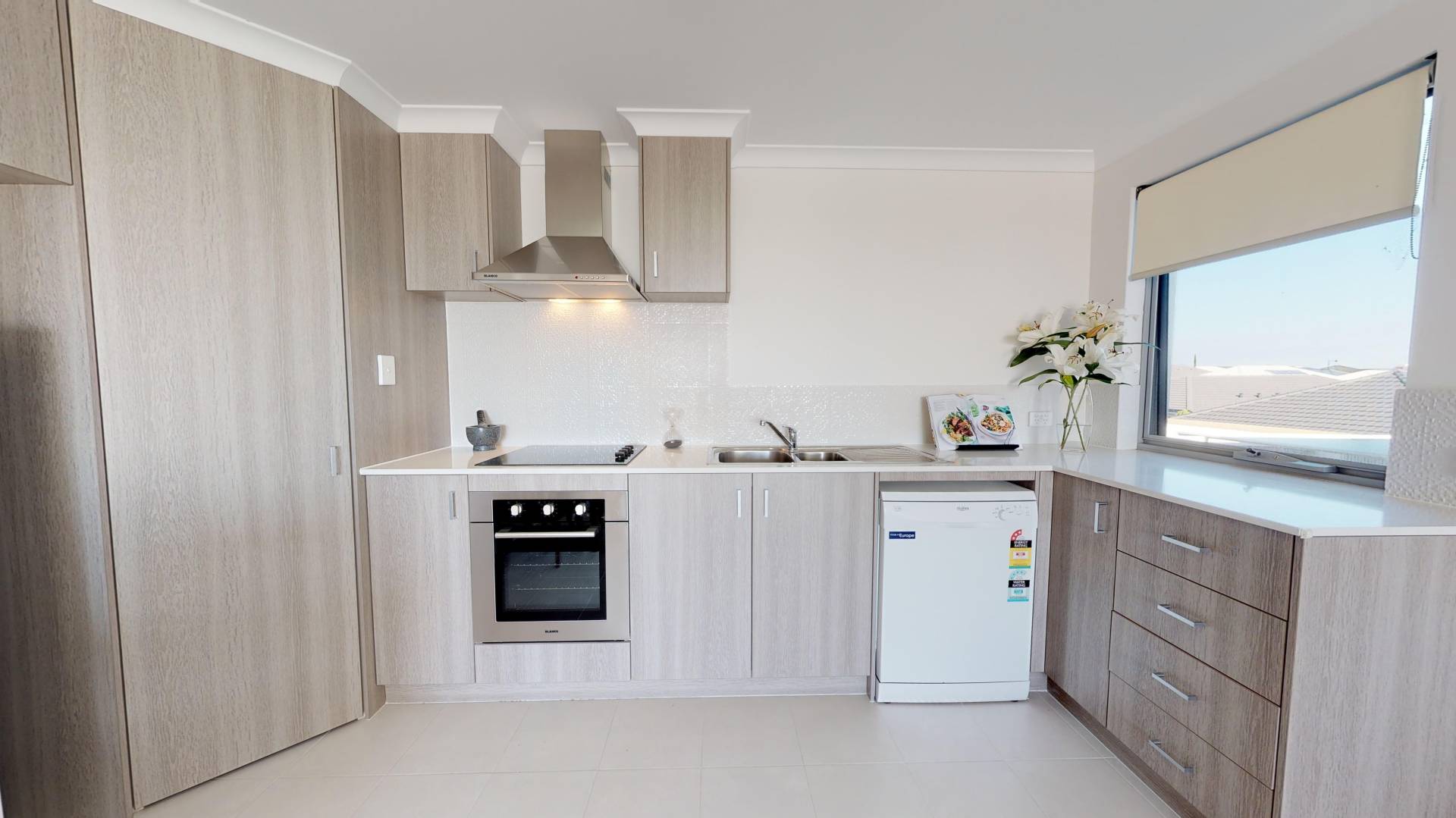 - The kitchen features a stainless steel oven with ceramic hotplate, a dishwasher and walk in pantry