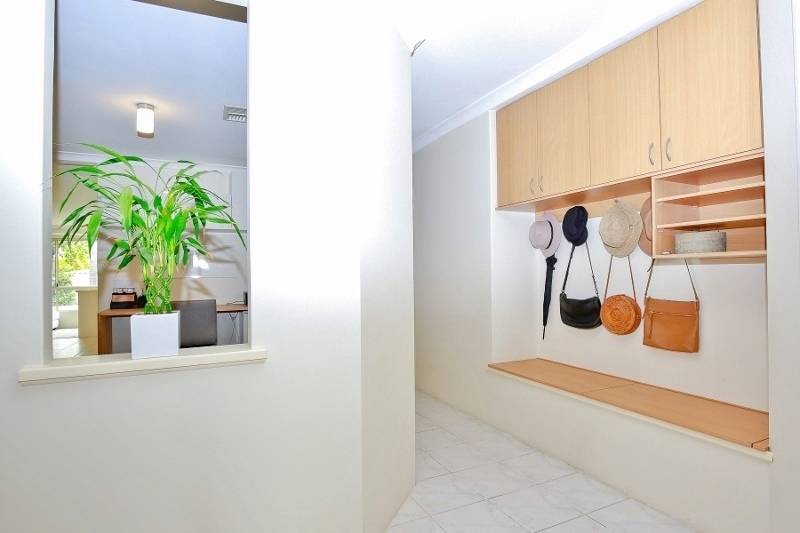 Security screen front door entry to separate foyer with inbuilt shelving and storage area