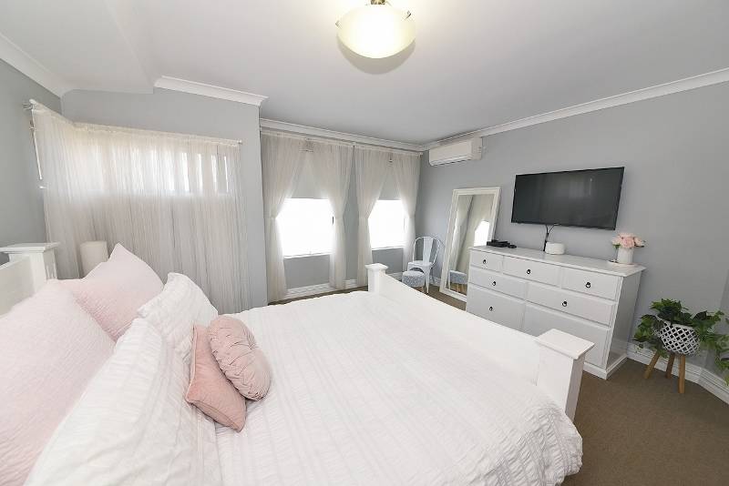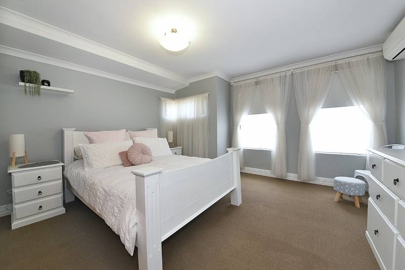 Master bedroom with a split system A/C and his and her’s separate WIR’s, plus stylish window treatments including block-out twin blinds