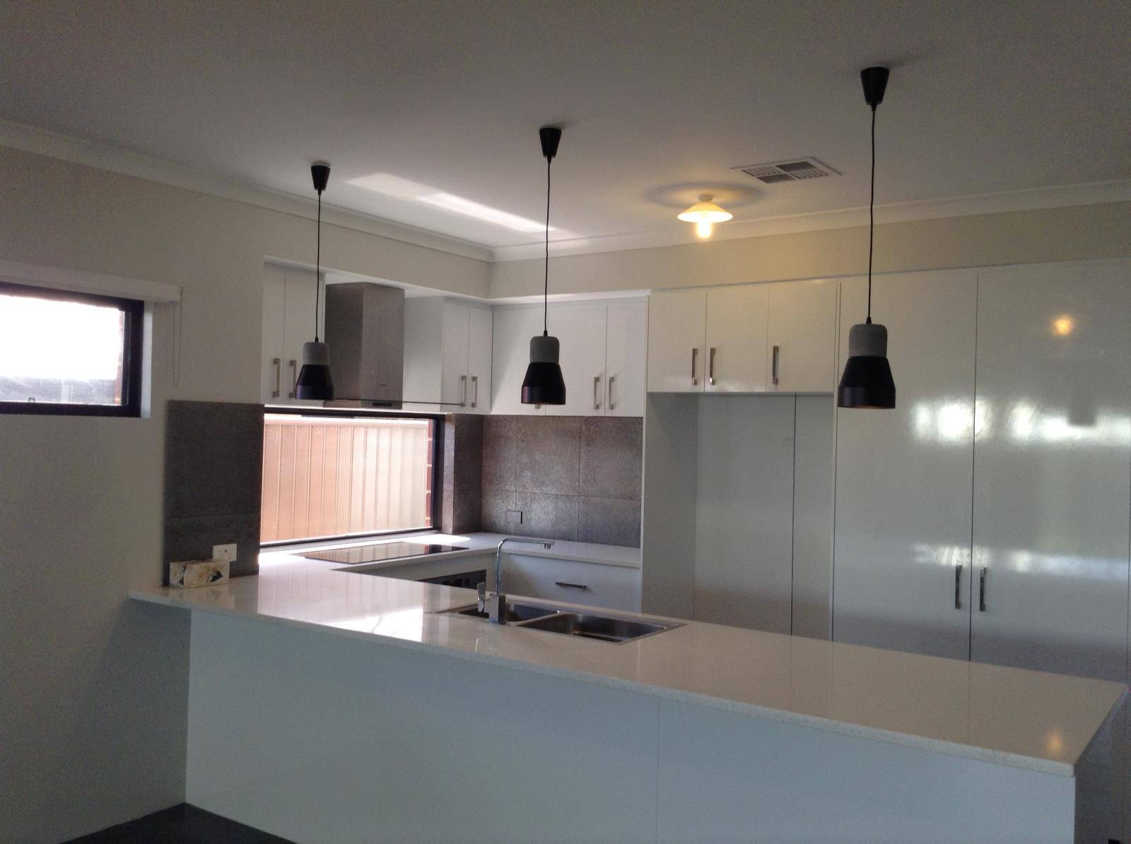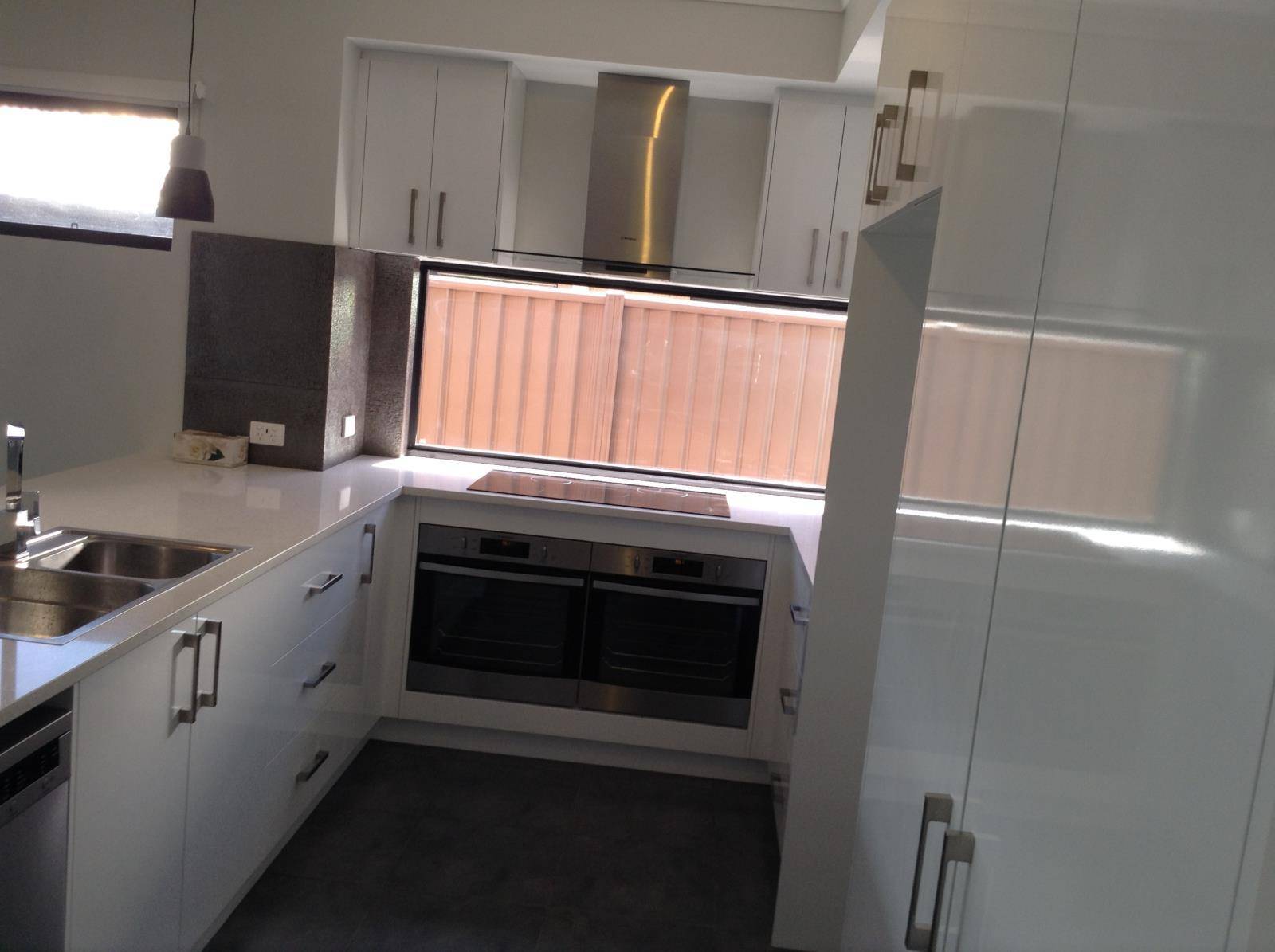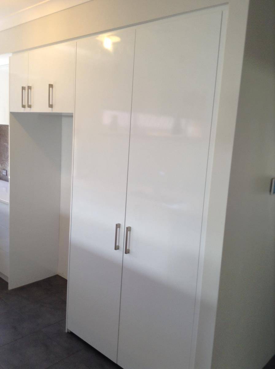 Huge walk in pantry with over and under bench cupboards with a high gloss, white finish and room for a double fridge as well.