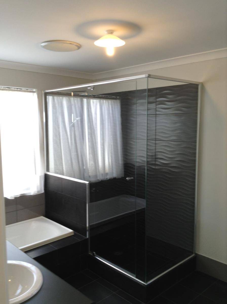 This leads you through to a very generous walk in robe and a stunningly beautiful bathroom, with dark tiles and overhead rain shower and hand held shower head.