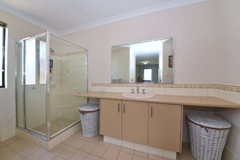 Light and bright ensuite with shower (with screen), full length vanity, heat lamp and separate WC