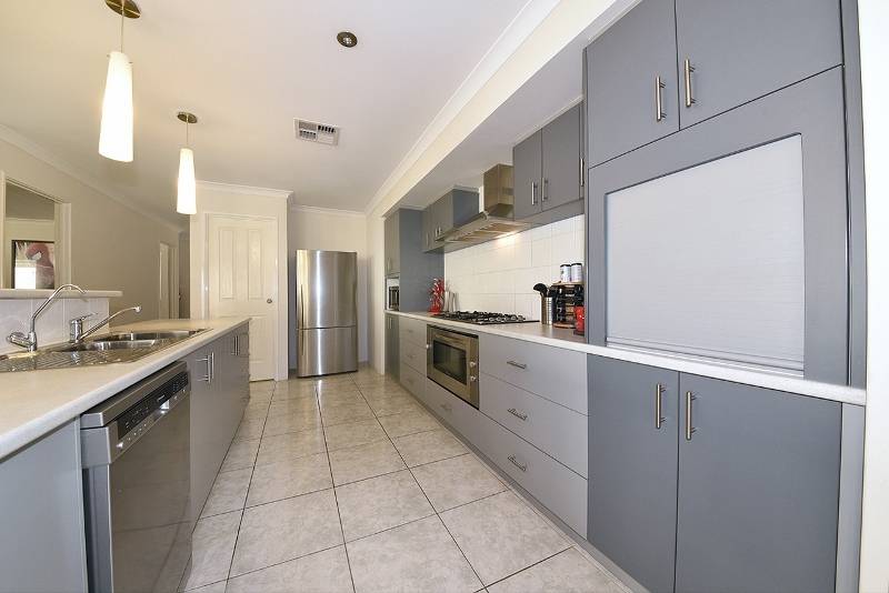 Central kitchen with feature overhead cupboards, 5 burner gas hotplate, 900ml underbench oven, rangehood, dishwasher , microwave recess, fridge/ freezer recess, tiled splashbacks and walk in pantry, all with ample bench and cupboard space