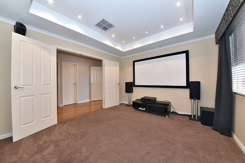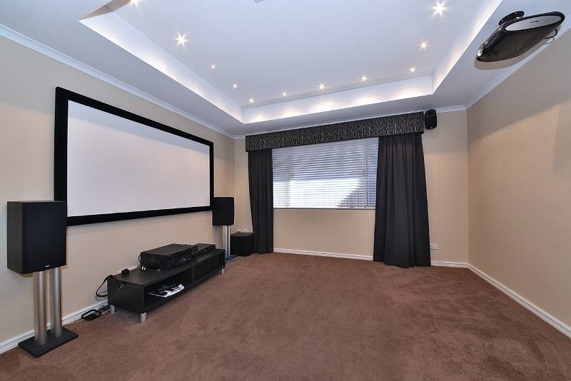 Enclosed home theatre with recessed ceiling and feature lighting
