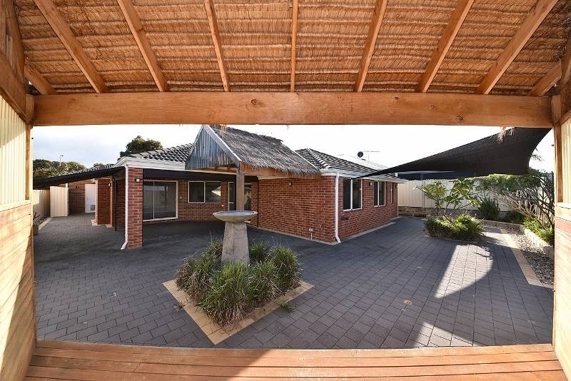 Masses of room for entertaining with 2 separate thatched cabanas, stylish water feature and easy care, tropical gardens