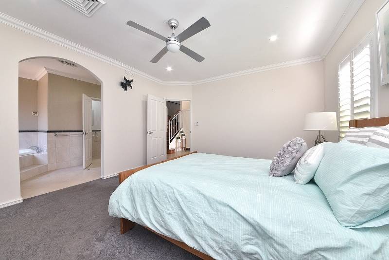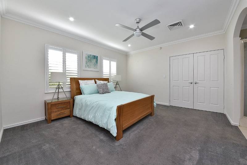 Spacious master bedroom with double door robe (with inbuilt shelving), ceiling fan and TV point