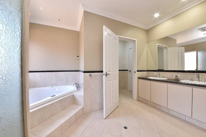 Resort style ensuite with feature tiling, shower (with screen), corner spa bath, twin vanities and separate WC