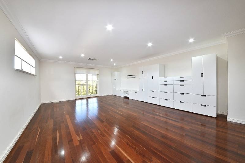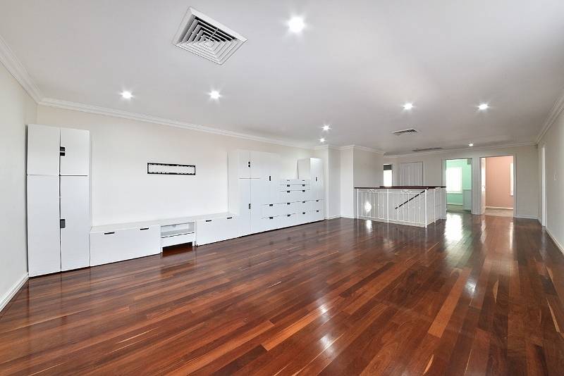Huge games room with solid wood flooring, inbuilt cupboards and feature double doors out to cedar lined balcony with amazing views