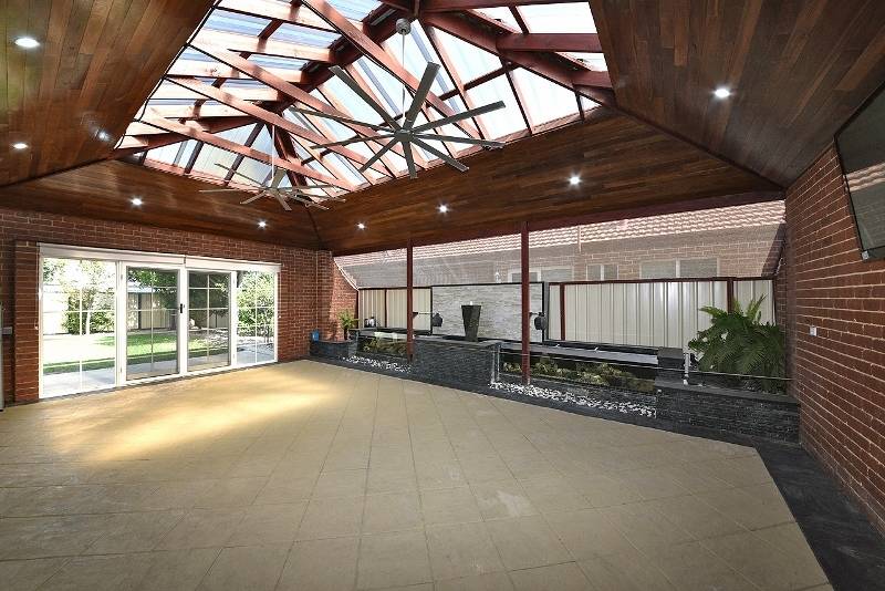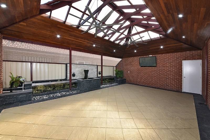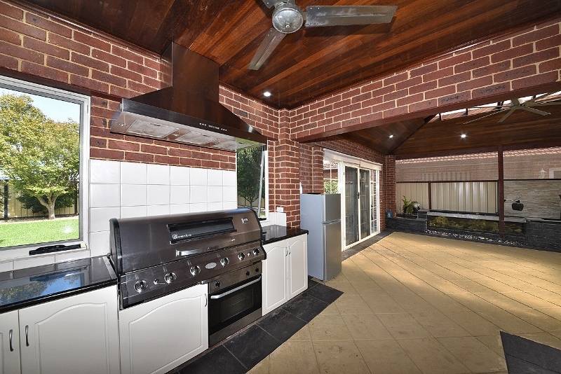 The best all year round alfresco entertaining with separate inbuilt gas bbq area with rangehood and oven, bench and cupboards, enormous pitched cedar lined roof, ceiling fans, water feature, sensational inbuilt fish ponds, double French doors to backyard with tonnes of lawn area for kids to play