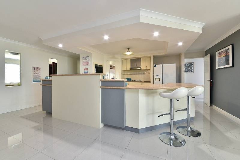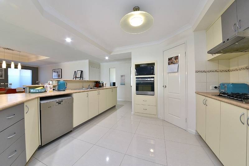 Magnificent central kitchen with quality appliances, dishwasher, rangehood, overhead cupboards and masses of cupboard and bench space, all with a feature bulkhead and lighting
