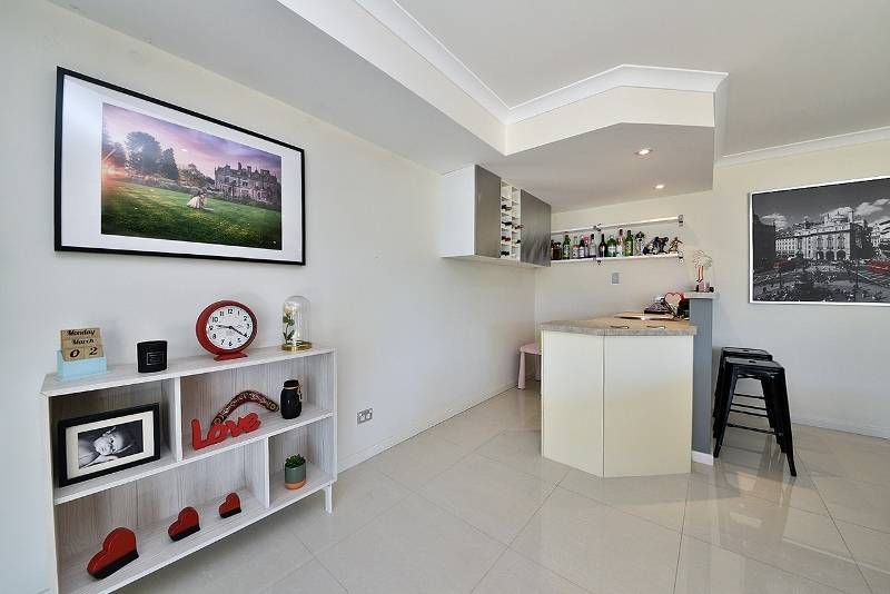 Open plan games room with inbuilt bar as well as retractable double sliding doors to outdoor entertaining