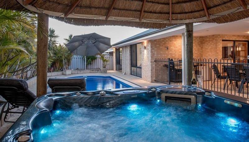 - Outdoor spa under a thatched gazebo overlooking the sparkling pool