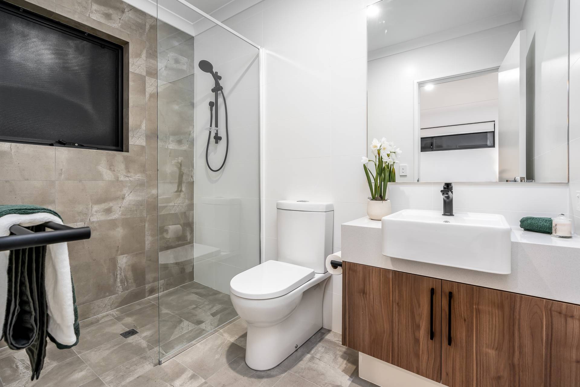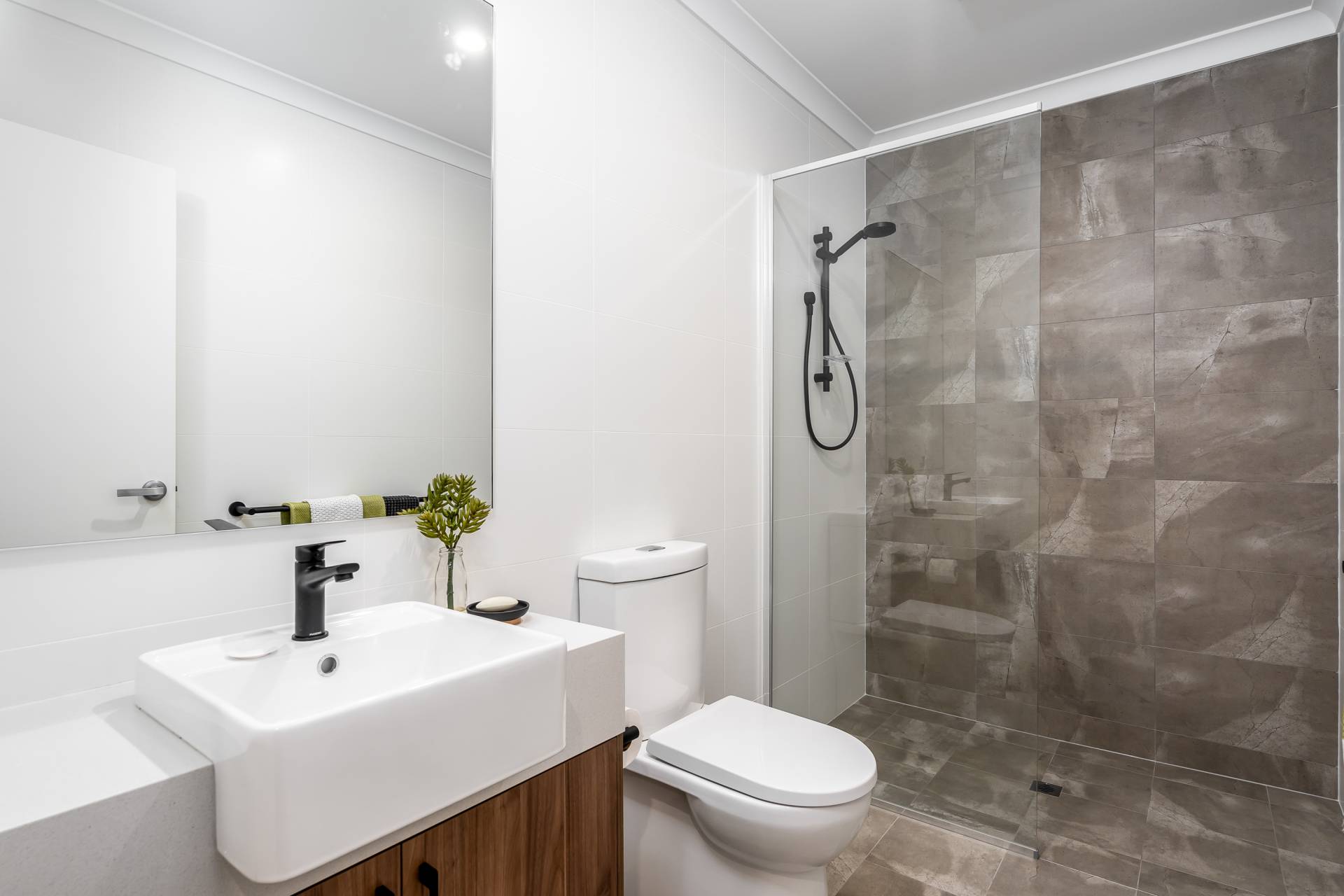 Bathrooms with stone benchtops | large feature tiled showers | floor- to-ceiling tiling