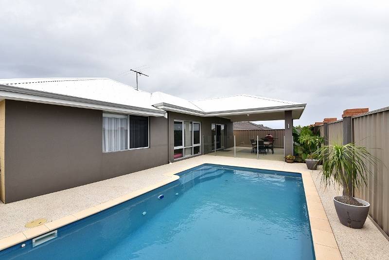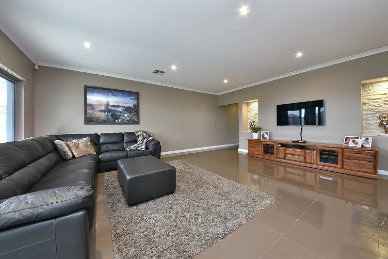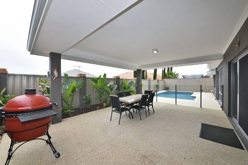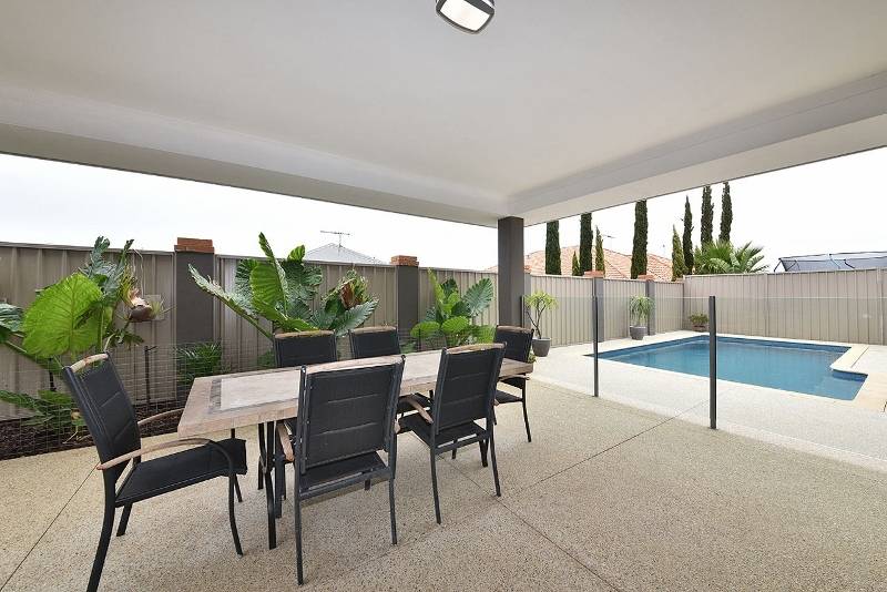 • Extra-large alfresco outdoor entertaining area with feature recess ceiling and lighting, all overlooking a fully fenced below ground pool and surrounded by stylish rendered external walls, poured aggregate concrete paving and easy care gardens