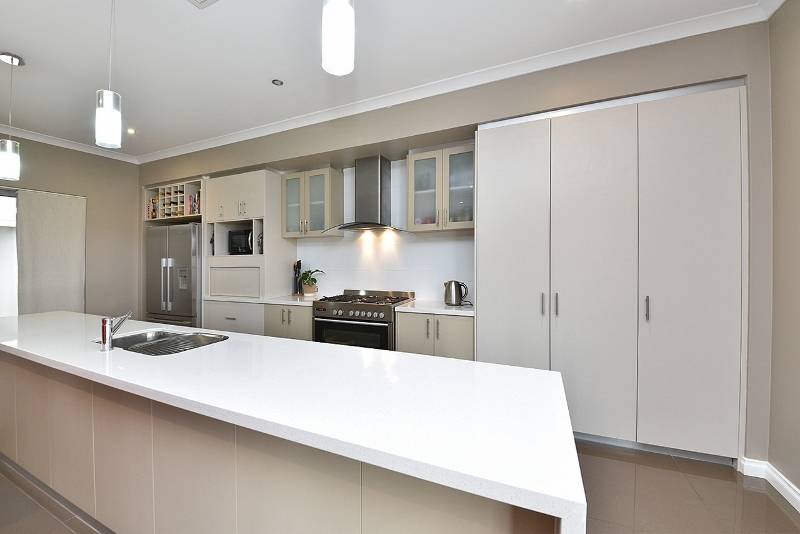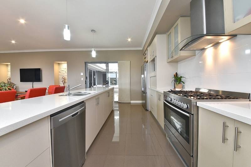 • First class kitchen with extra length quality stone bench tops and cupboards, extensive cabinetry, stylish splashbacks, stainless steel appliances including 900ml freestanding oven, gas cooktop and rangehood plus dishwasher, fridge / freezer recess and an amazing attention to detail