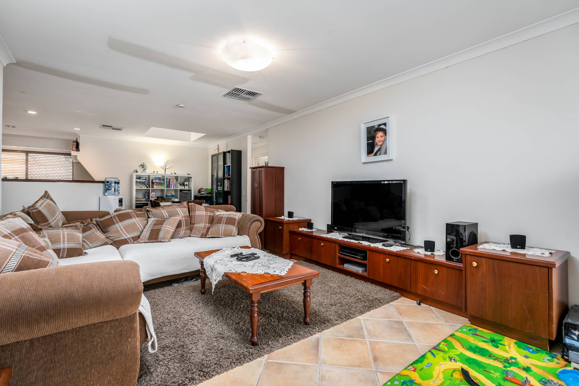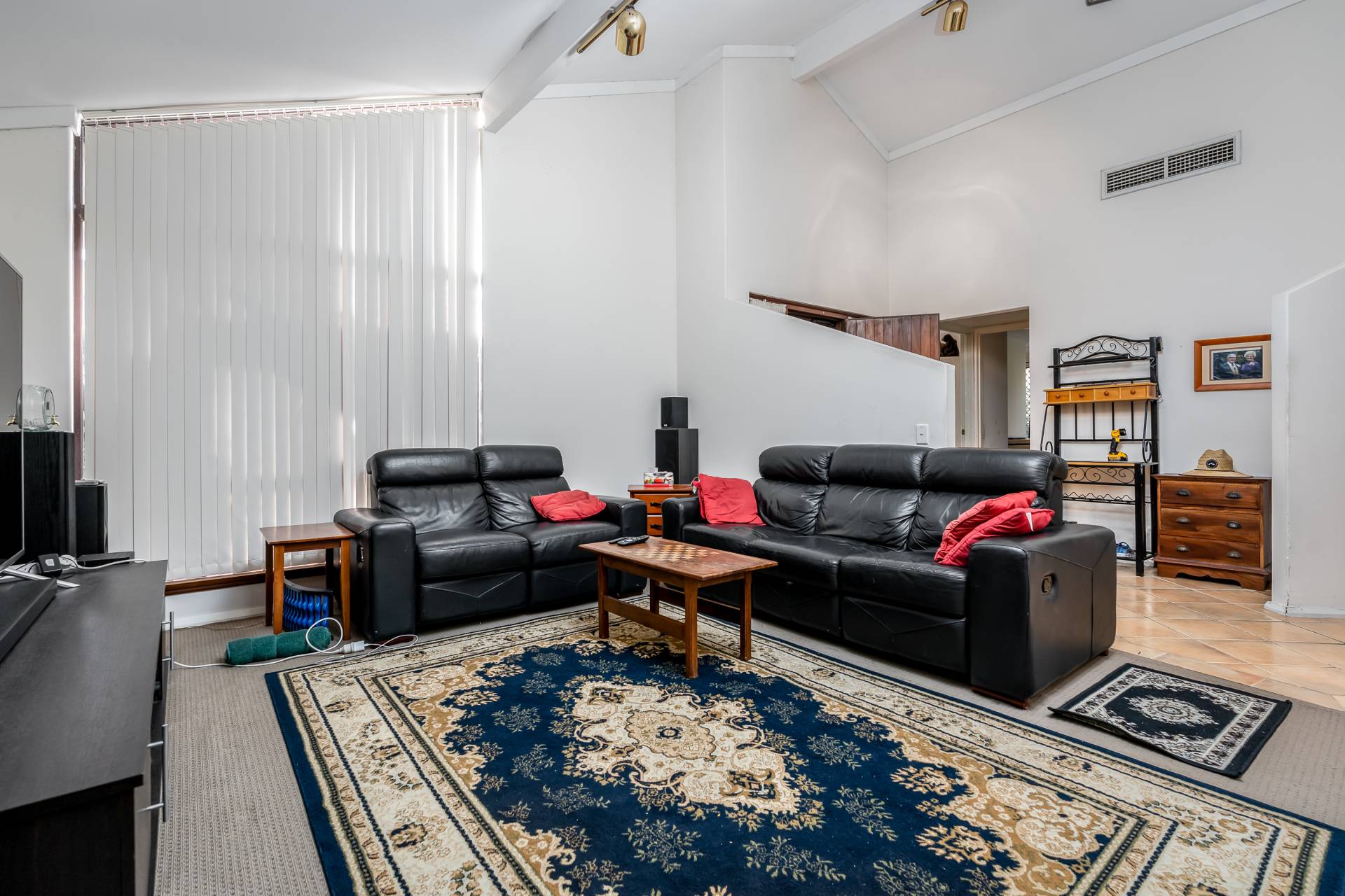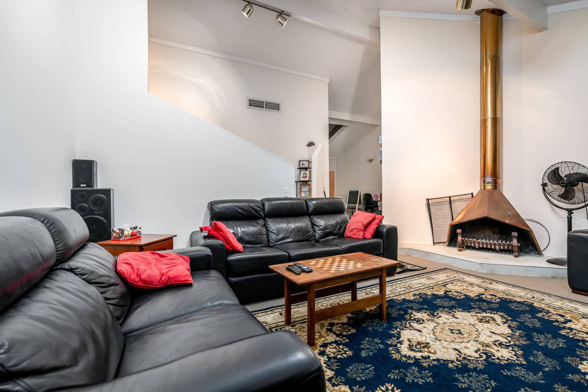 - Spacious living with high vaulted ceilings, feature wood fire place and large windows for lots of natural light