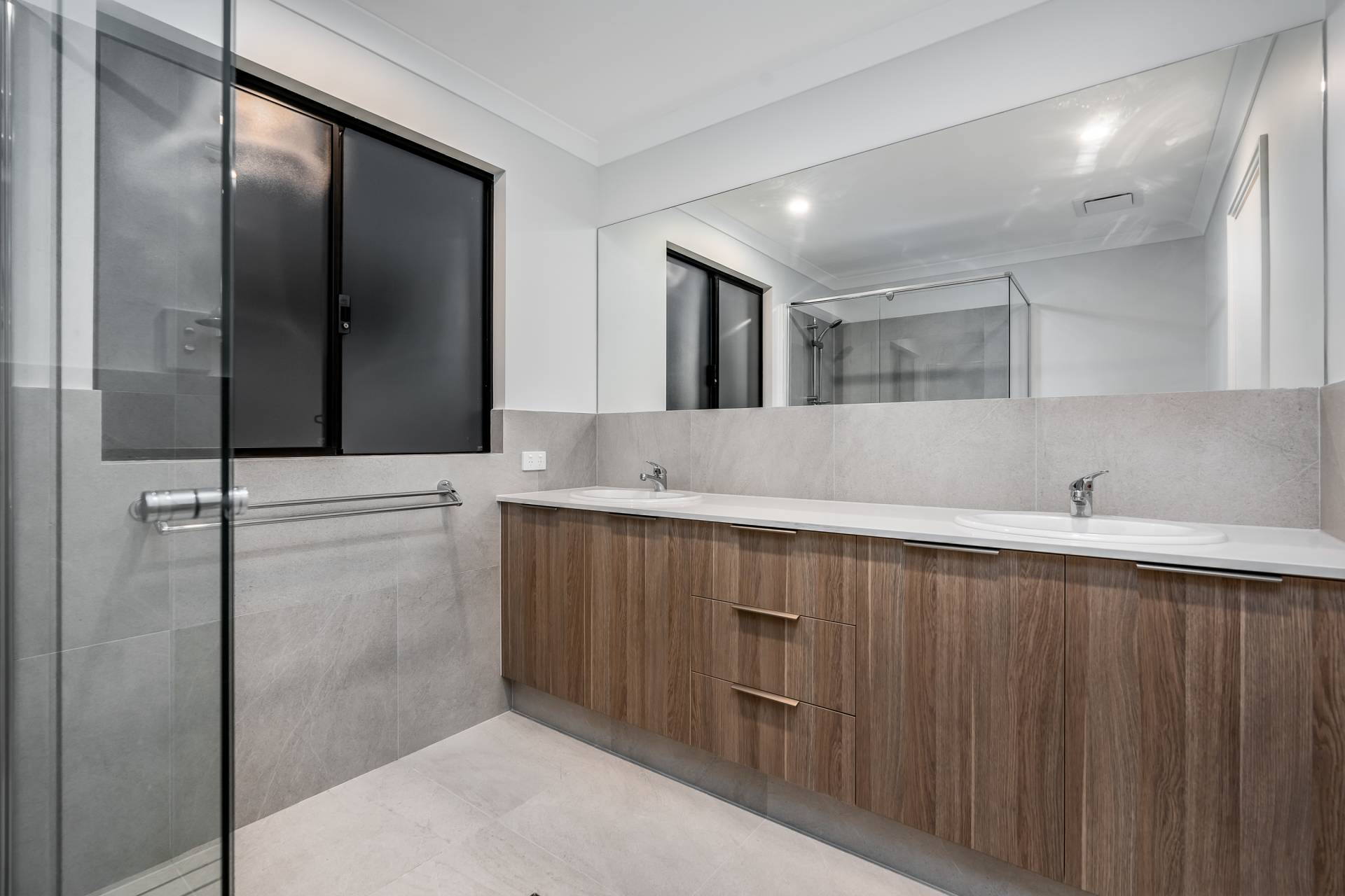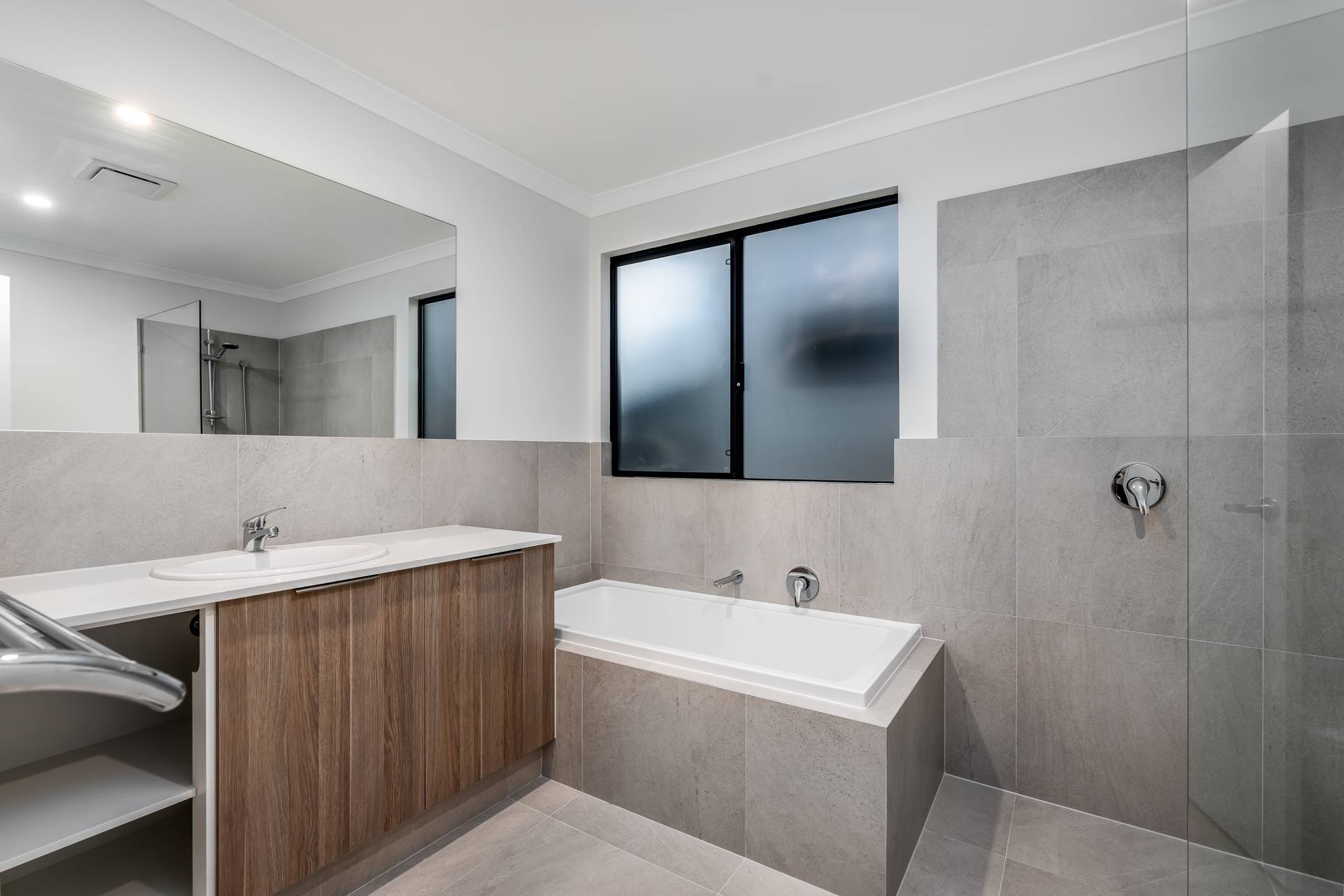 - Stylish and modern main bathroom complete with wood look cupboards, stone benchtop and a separate shoer and bath