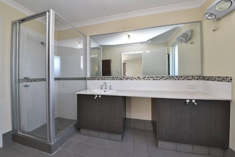 Modern ensuite with extra length stone benchtop and mirror, shower with screen and separate WC