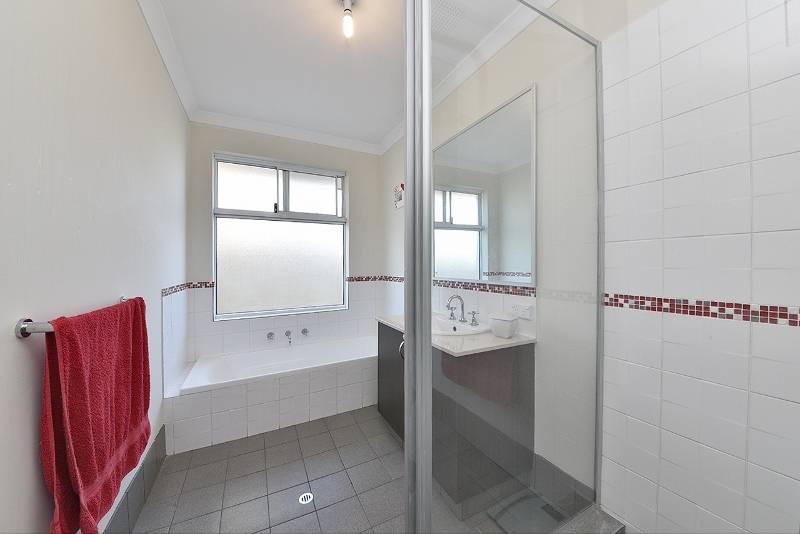 Modern 2nd bathroom with bath and shower (with screen) and vanity with stone benchtop