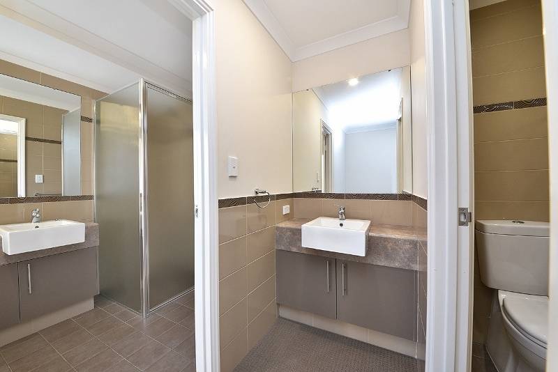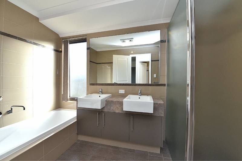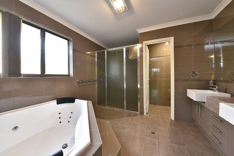 Quality 2nd bathroom with bath, shower (with glass door screen), twin vanities and full height tiling