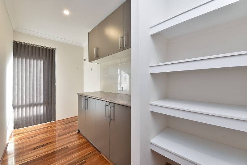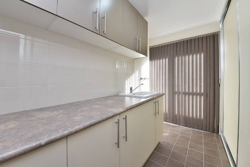 Well-appointed laundry with inbuilt bench and cupboards as well as sliding door linen closet