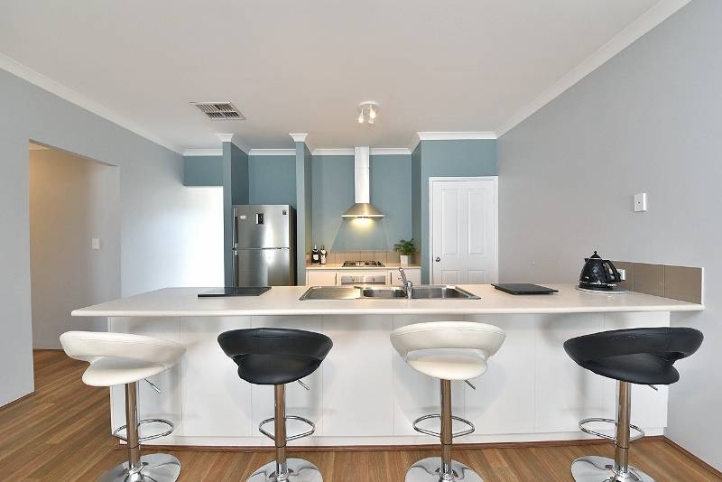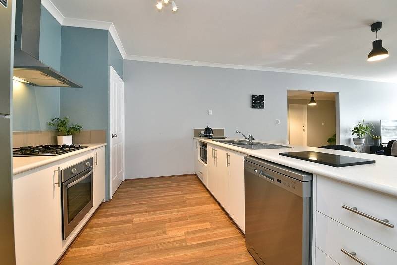 Central kitchen with extra length bench, 4 burner gas hotplate, stainless steel underbench oven, rangehood, dishwasher, fridge recess and ample cupboard space