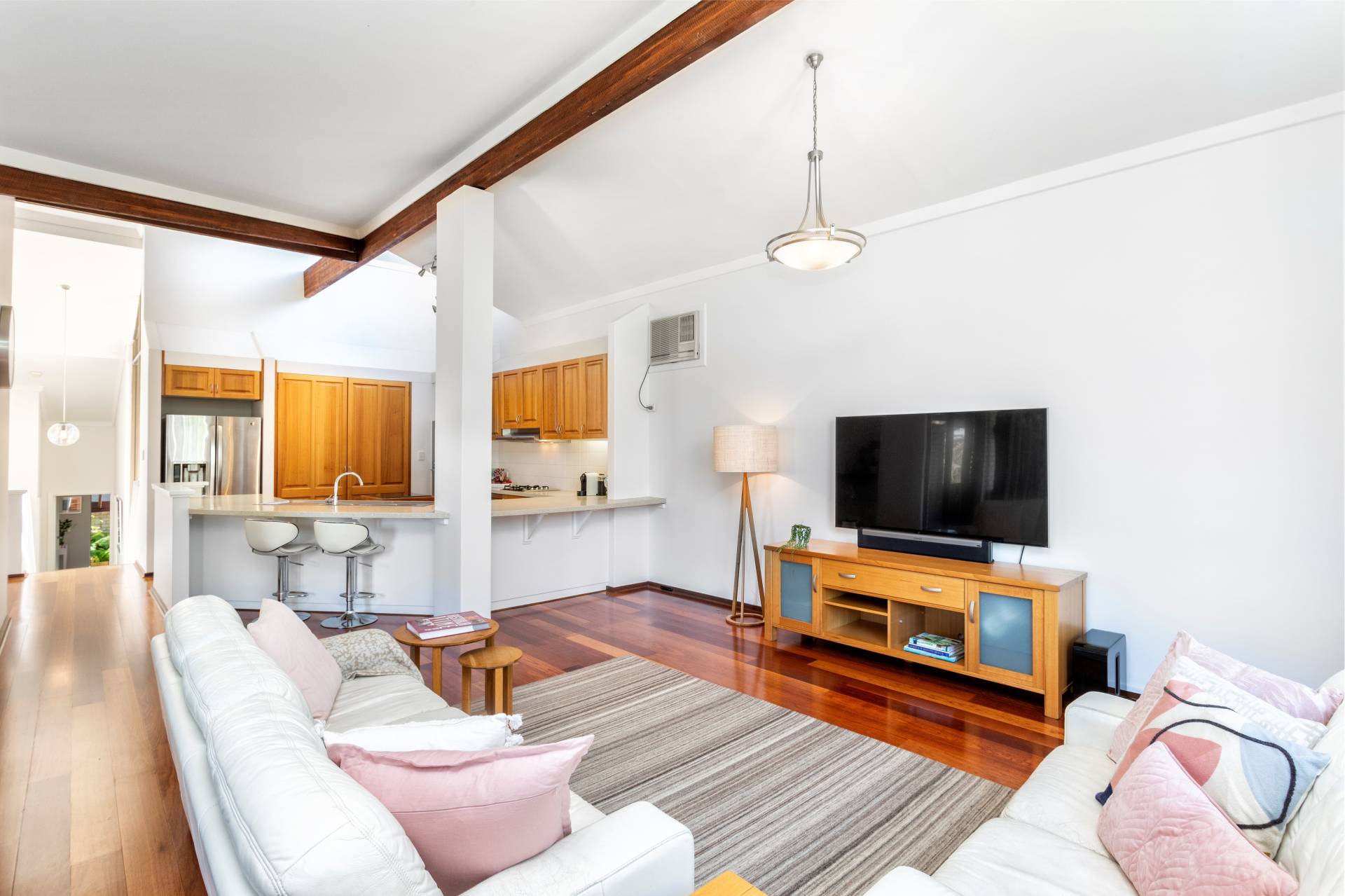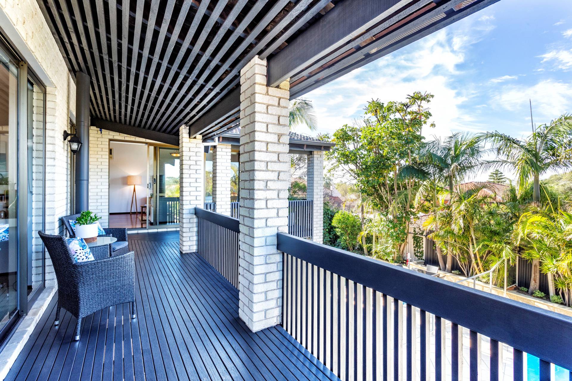 Stylishly Incorporating extra high vaulted ceilings with exposed feature timber beams, stunning large window walls and a funky fireplace to the upper floor, the huge open plan living areas open on onto a wrap-around timber entertaining deck that enjoys elevated inland tree-top views and a full view of the back garden and family sized pool area-ideal for keeping a close eye on the kids.The large kitchen, with quality appliances and generous cupboard space, and meals area are at the heart of the upper floor living and entertaining area.