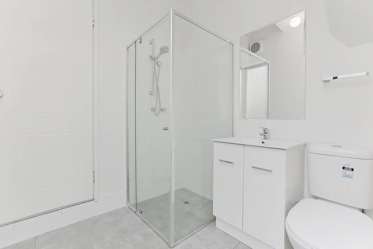 2nd upstairs bedroom with built-in robes, its own private tiled rear balcony and a fully-tiled ensuite bathroom - complete with a shower, toilet, vanity and heat lamps
