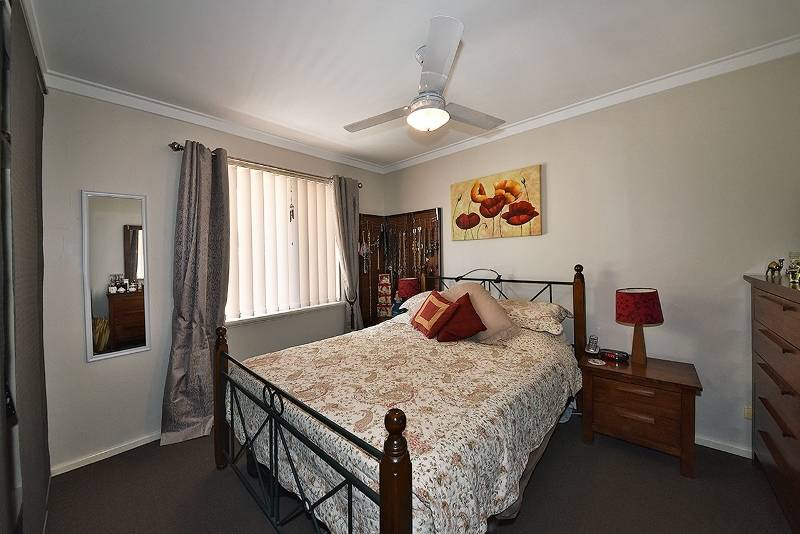 Spacious master bedroom with ceiling fan and robes