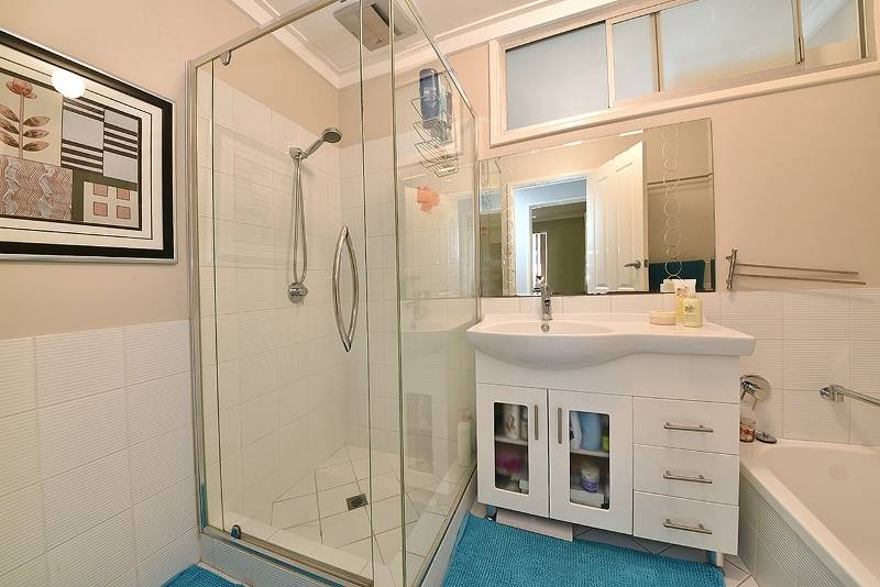 Renovated bathroom with shower with screen, bath and separate vanity