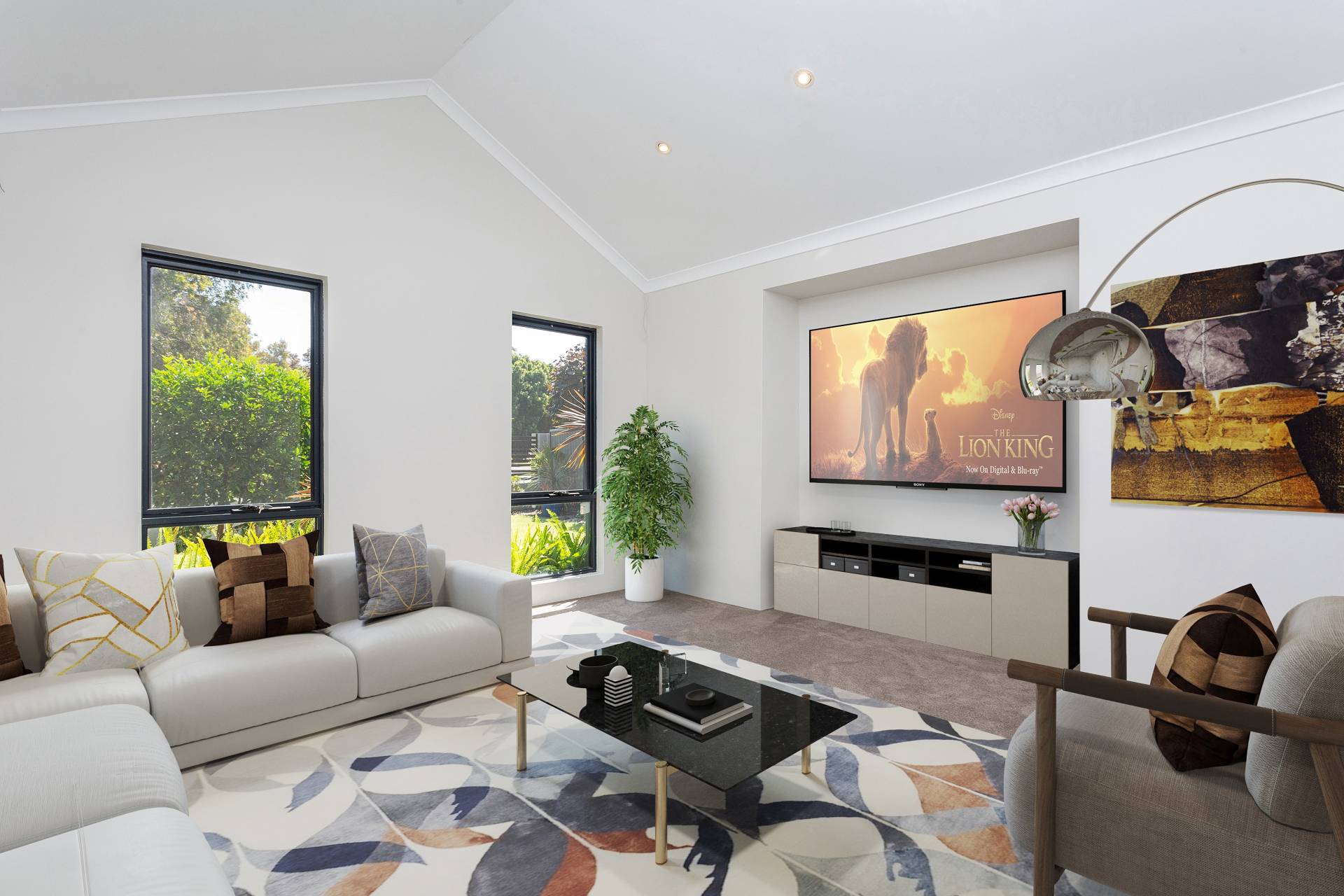 A double door front entry welcomes you into to this delightful light filled home incorporating a fabulous theatre/activity room with high vaulted ceiling, guest bedroom on the ground floor with adjoining full bathroom and open plan family/meals and kitchen zone that opens onto the rear alfresco entertaining and pool area.
